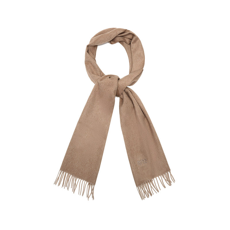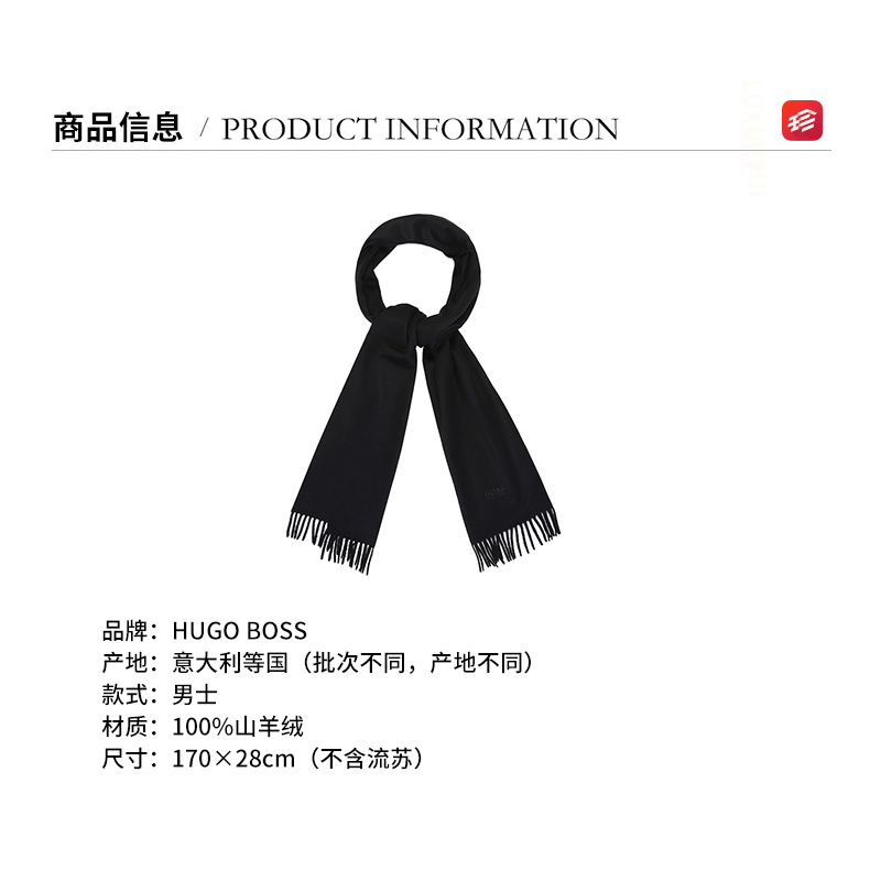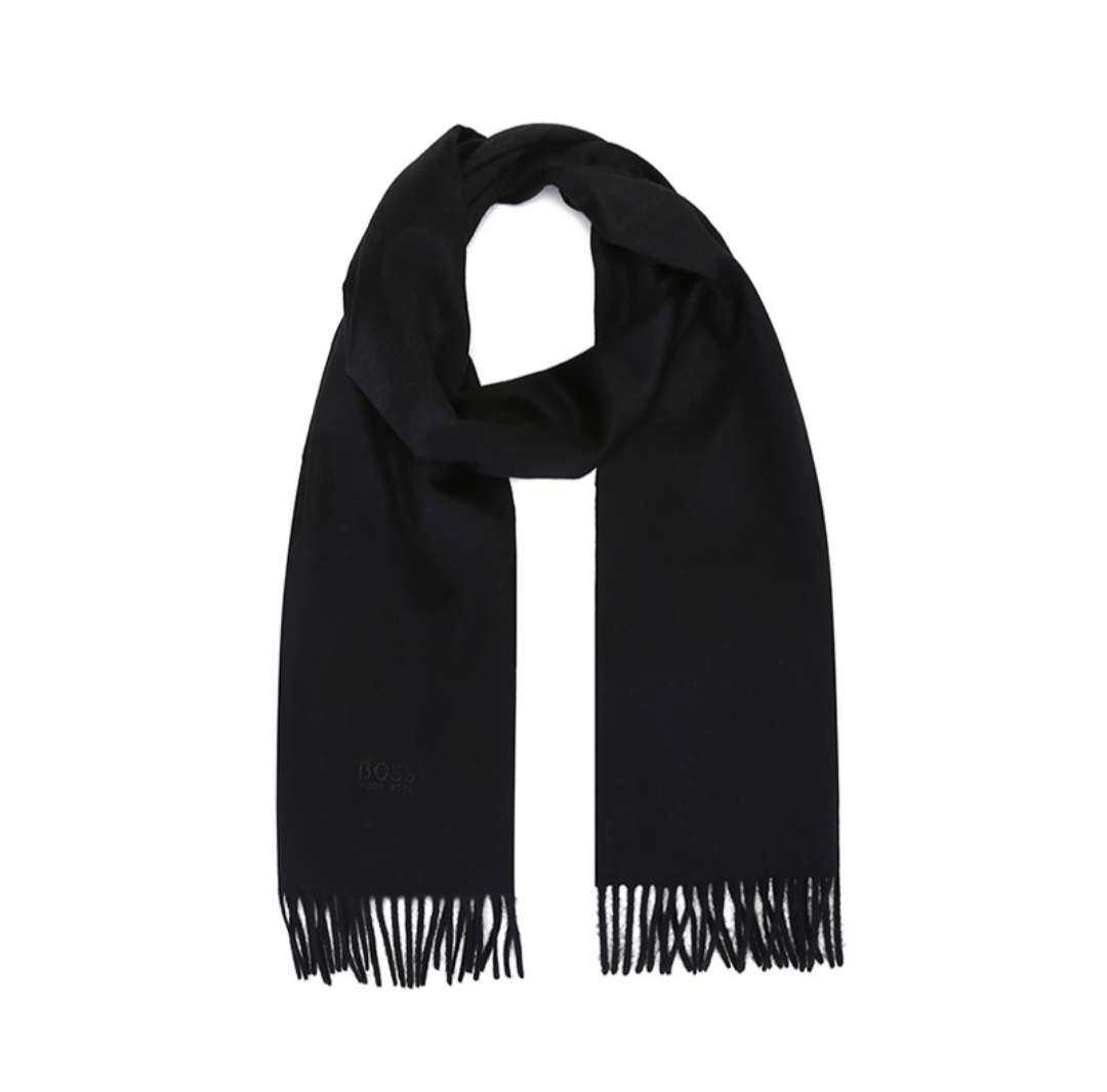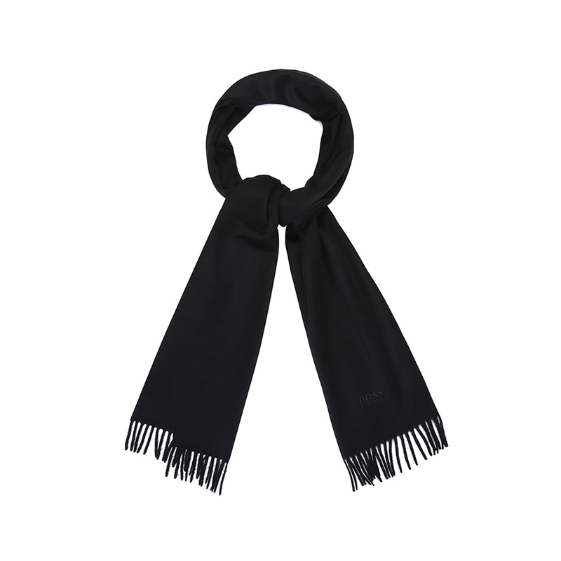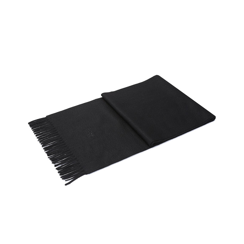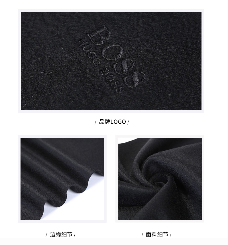自营Hugo Boss 雨果博斯 男士山羊绒保暖流苏薄款围巾黑色LOGO刺绣170*28cm 50415017 001