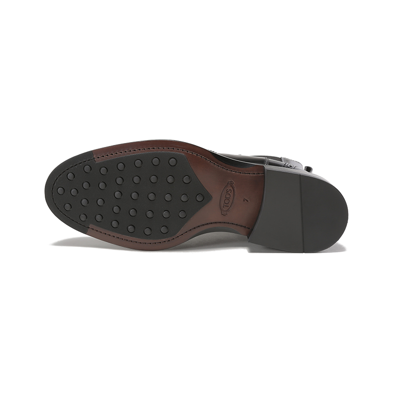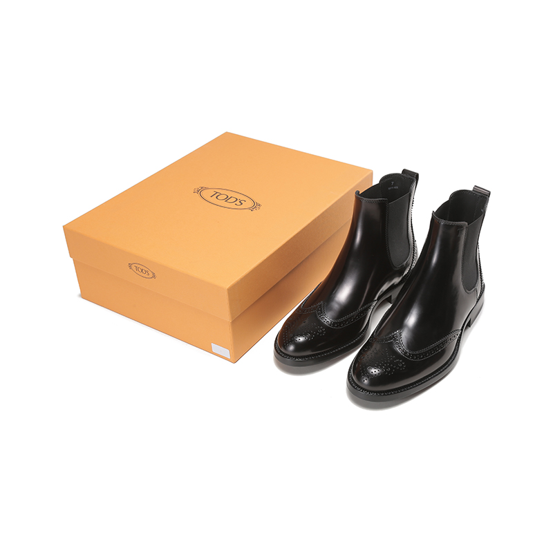 - 本款踝靴以雅致牛皮制成,配以翼尖穿孔雕花,侧边弹力面料衬垫和Tod's 字母商标,牛皮鞋底嵌有橡胶。