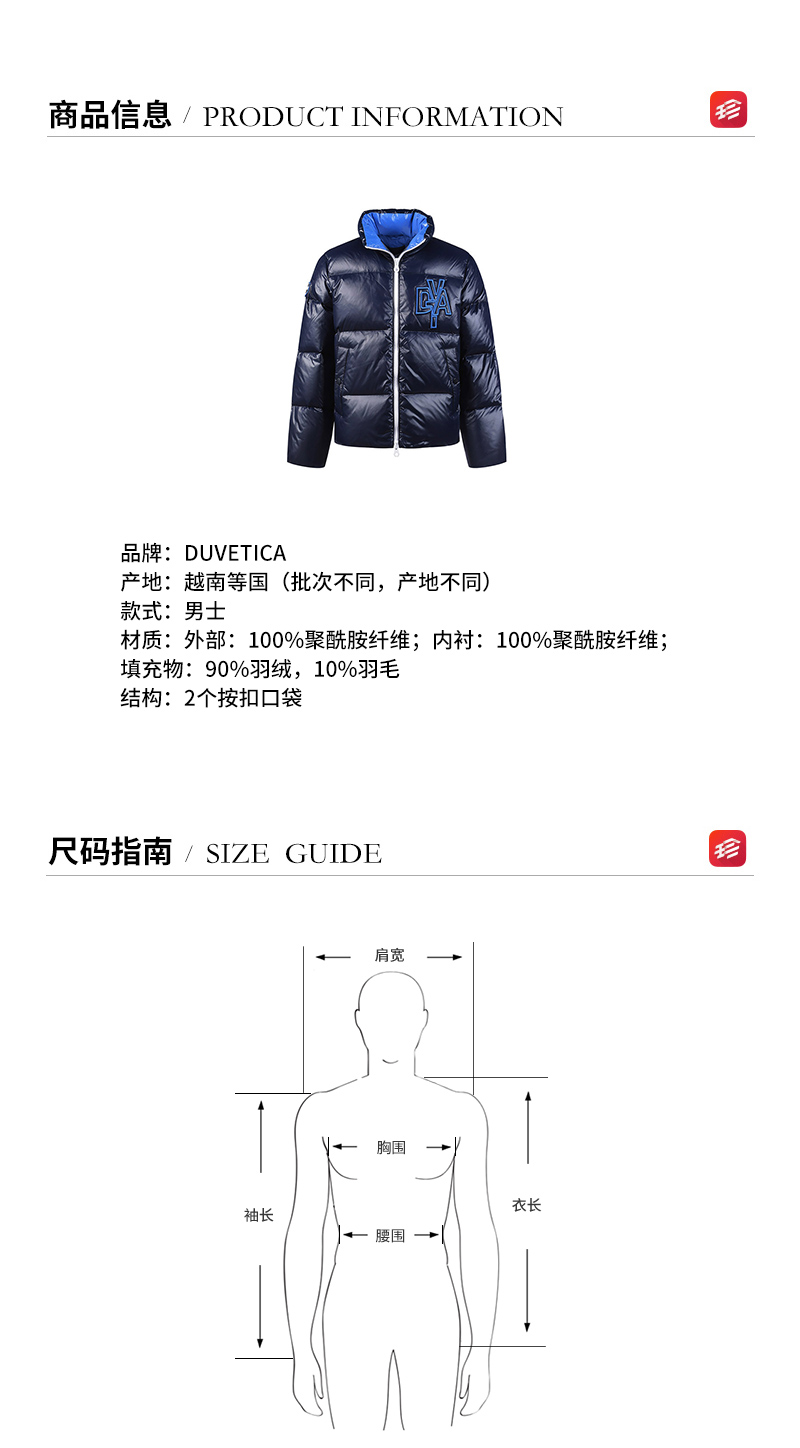 - 材质:外部:100%聚酰胺纤维;内衬:100%聚酰胺纤维;填充物:90%羽绒,10%羽毛