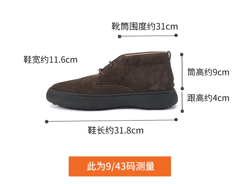 - 尺寸:鞋长约31.8cm,鞋宽约11.6cm,跟高约4cm,筒高约9cm,靴筒围度约31cm(此为9/43码测量)