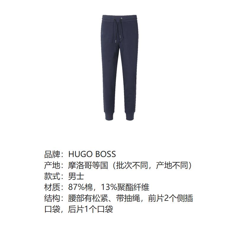 - BOSS 超柔软运动裤。这款单品精选双面棉毛面料,采用常规版型剪裁和束口裤脚设计,饰有精美的双 B 交织字母图案。