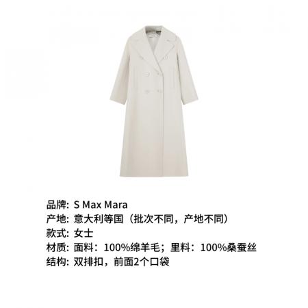 自营S Max Mara 麦丝玛拉【新品】女士绵羊毛米白色双排扣长款大衣外套 CUSTODI 055 19011031
