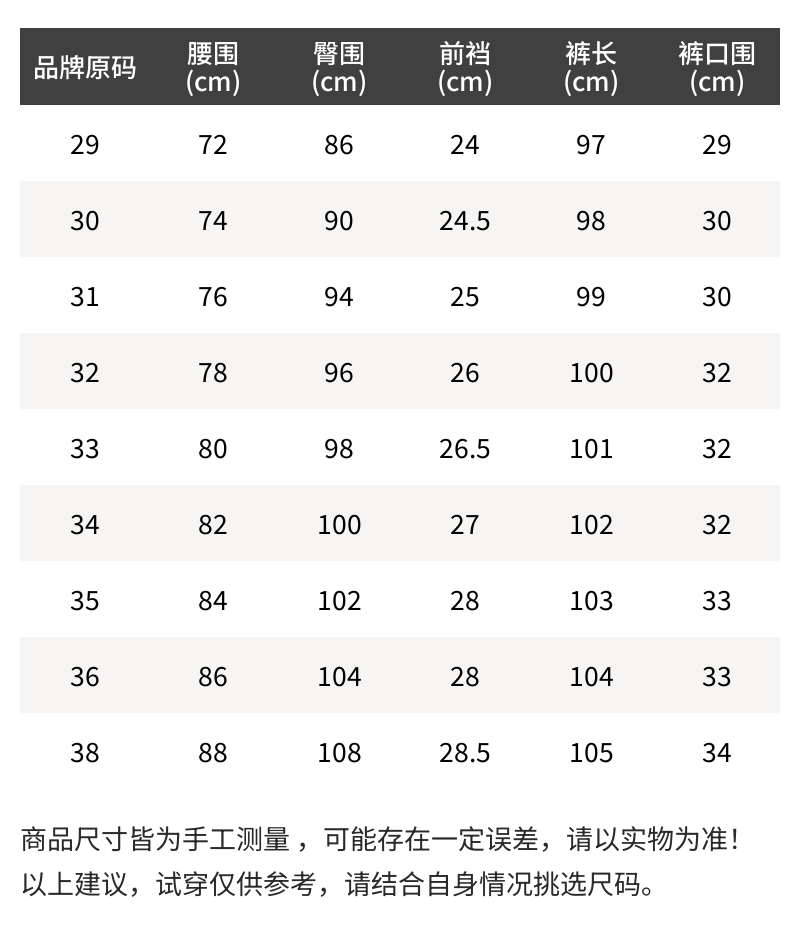 - 温馨提示:1.丢失包装及附件或拆除防损标签/吊牌时不予退换,敬请理解。2.批次不同,产地/细节有所不同,随机发货。3.所有尺寸皆为手工测量,存在1~3cm误差,请以实物为准!