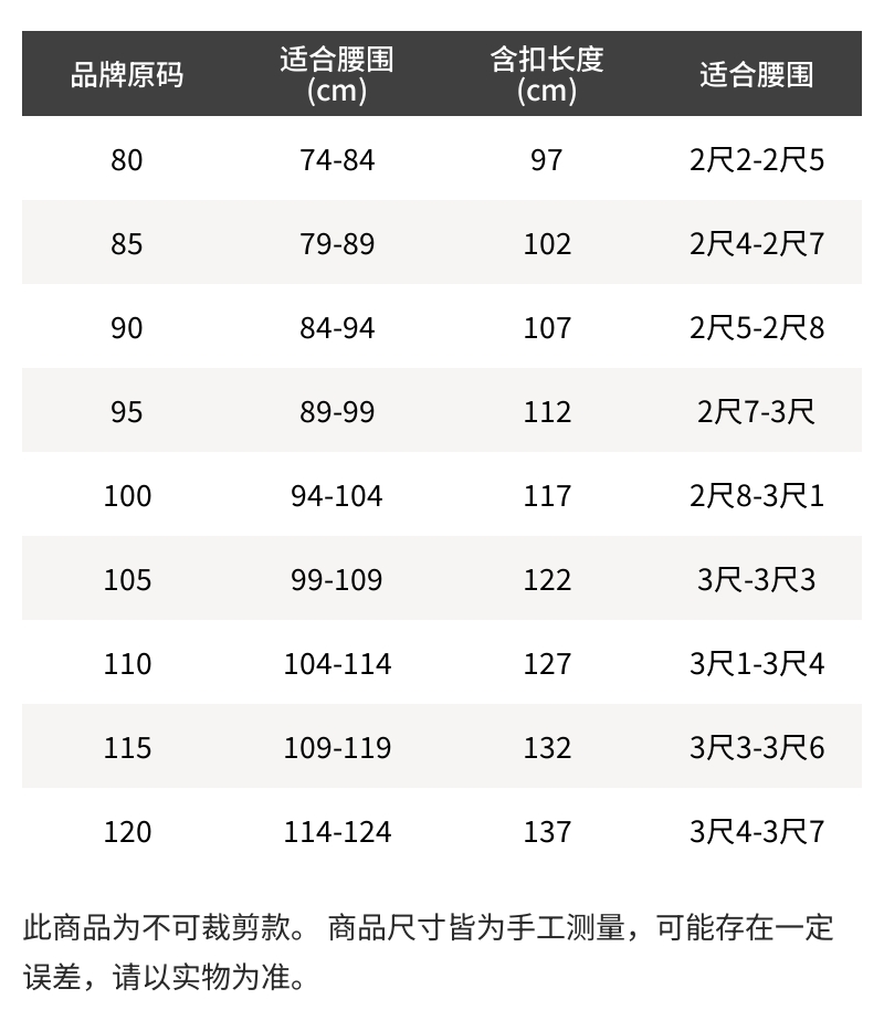- 结构:针扣式腰带,5个扣眼,长度不可裁剪