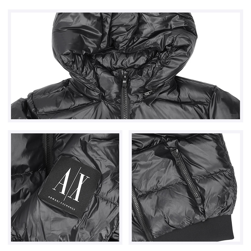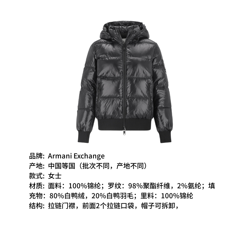 自营Armani Exchange 阿玛尼 新品 女士黑色AX徽标胶印鸭绒连帽羽绒服外套 XW000228 AF10860 UC001