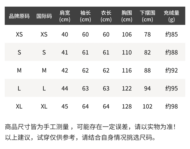 - 材质:面料:100%锦纶;罗纹:98%聚酯纤维,2%氨纶;填充物:80%白鸭绒,20%白鸭羽毛;里料:100%锦纶