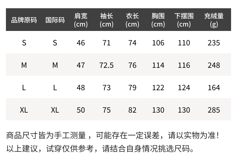 - 材质:面料:84%聚酯纤维,16%棉;里料:100%聚酰胺纤维;填充物:鸭绒(含绒量80%)
