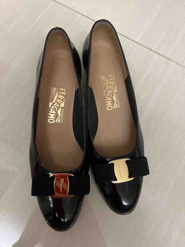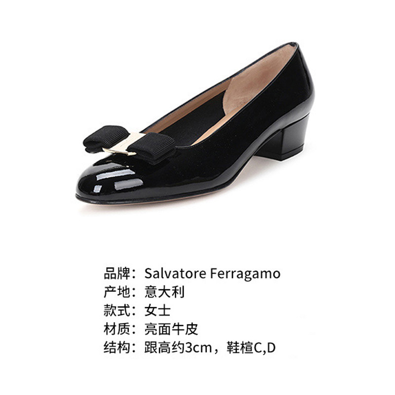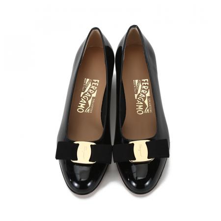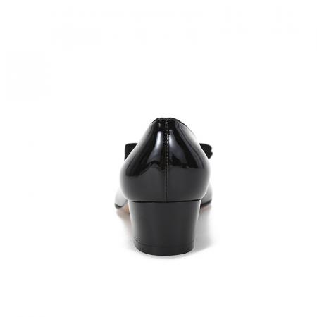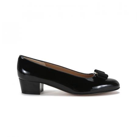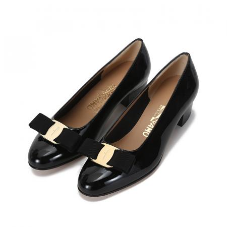 自营Ferragamo 菲拉格慕女士VARA系列黑色亮面牛皮蝴蝶结3cm粗跟鞋 0574572