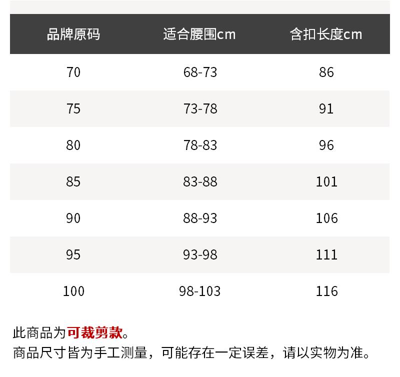 - 结构:板扣式腰带,3个扣眼,长度可裁剪
