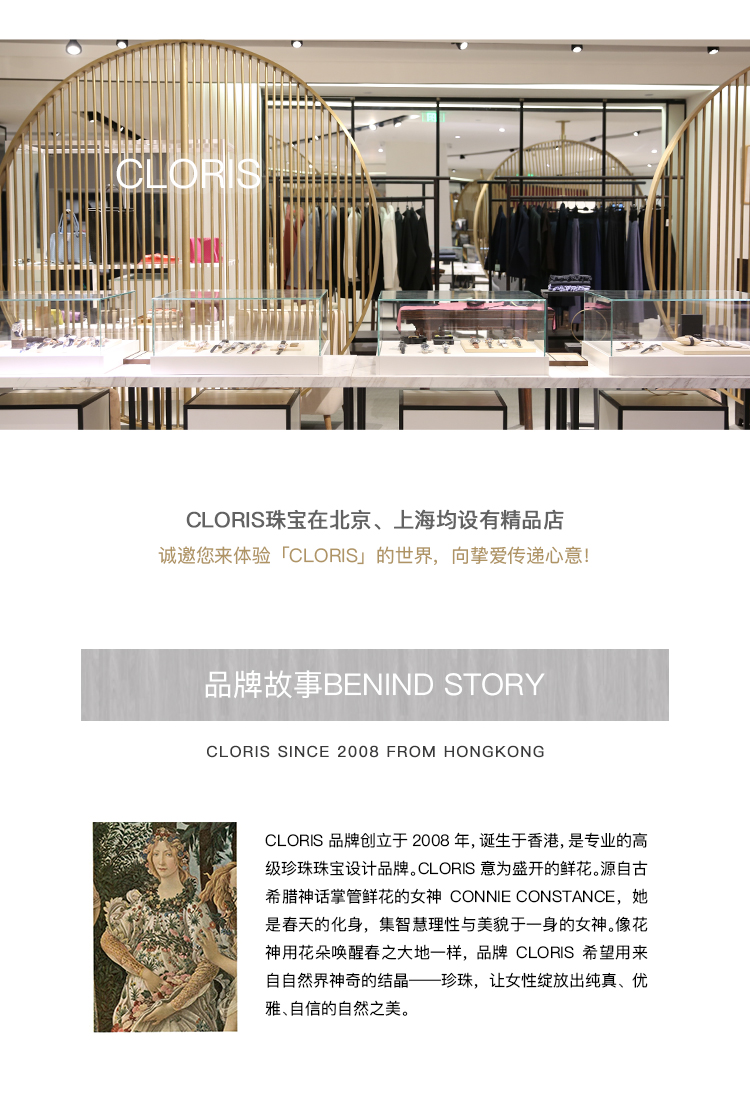 CLORIS创立于2008年,品牌诞生于香港,致力于原创设计制作最适合亚洲人的珠宝轻奢品牌。CLORIS 源自古希腊神话掌管鲜花的女神CONNIE CONSTANCE。简约,经典,艺术,超凡脱俗的设计是每一季原创新品的追求极致。 CLORIS注重珠宝的优雅,神圣,灵气。使得每件独特的作品得到最大程度的展现。