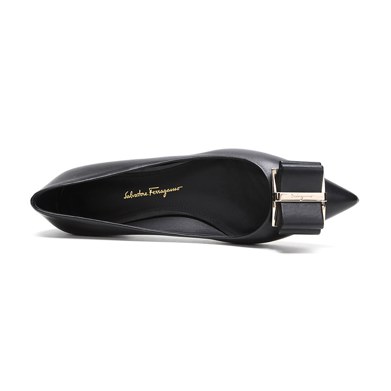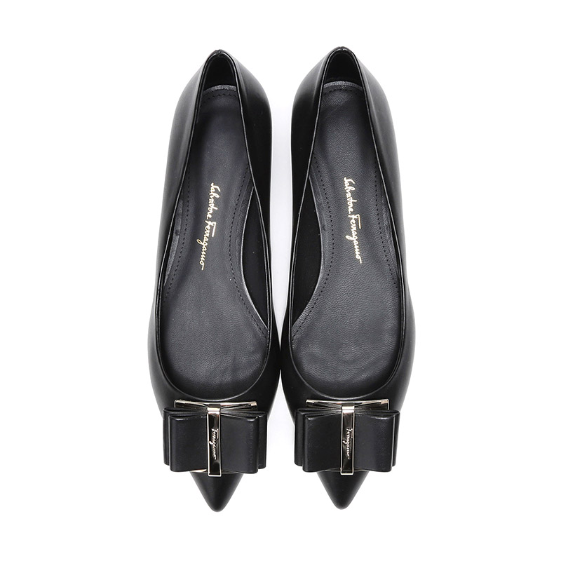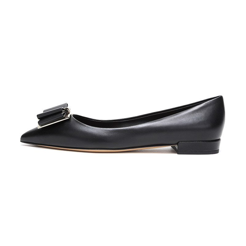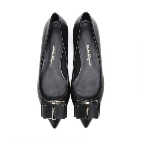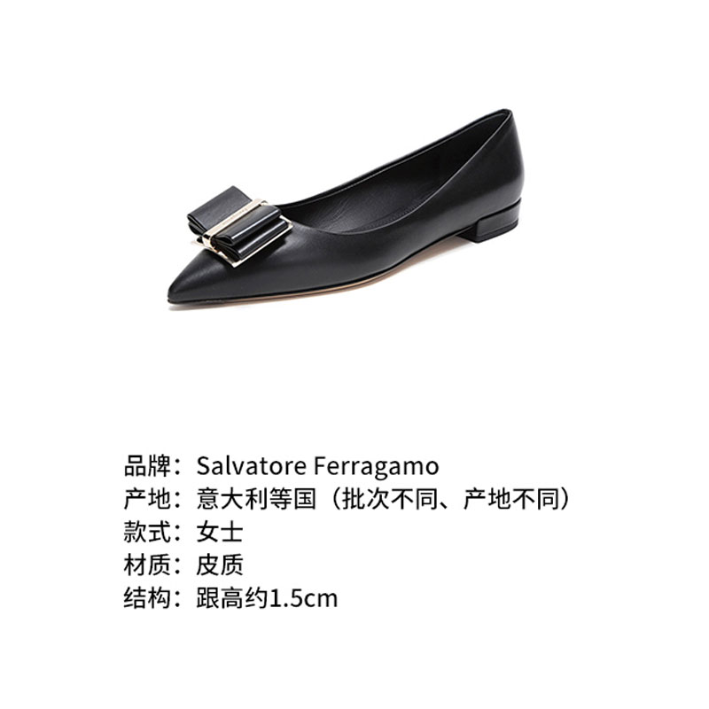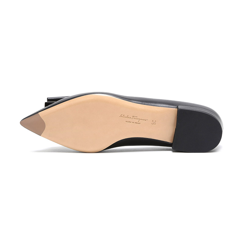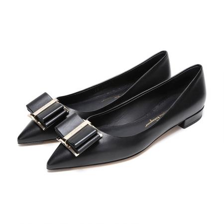 自营Ferragamo 菲拉格慕 女士黑色皮质双蝴蝶结平底鞋尖头单鞋 0704646