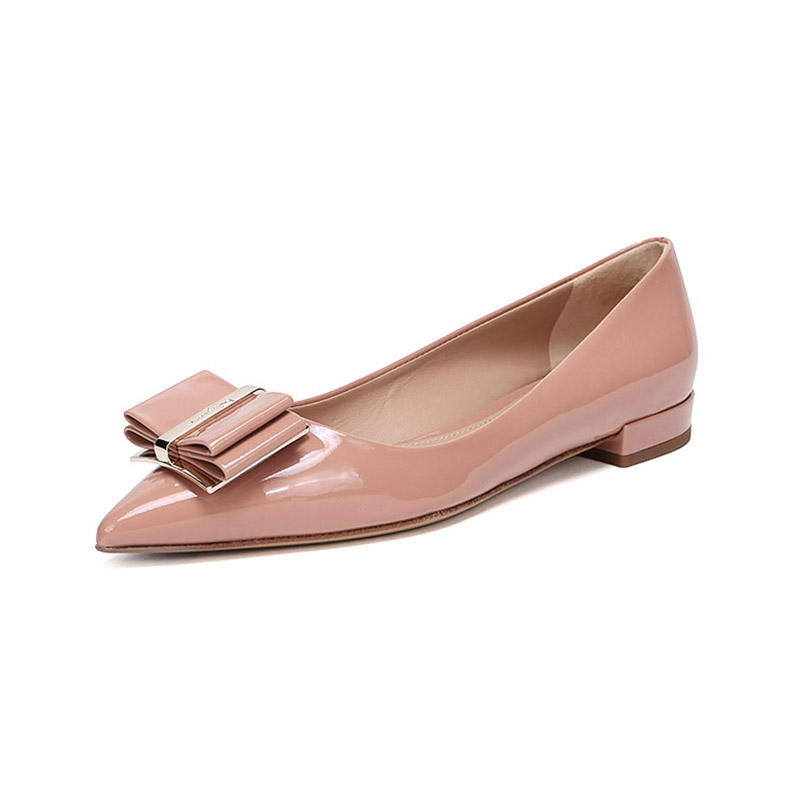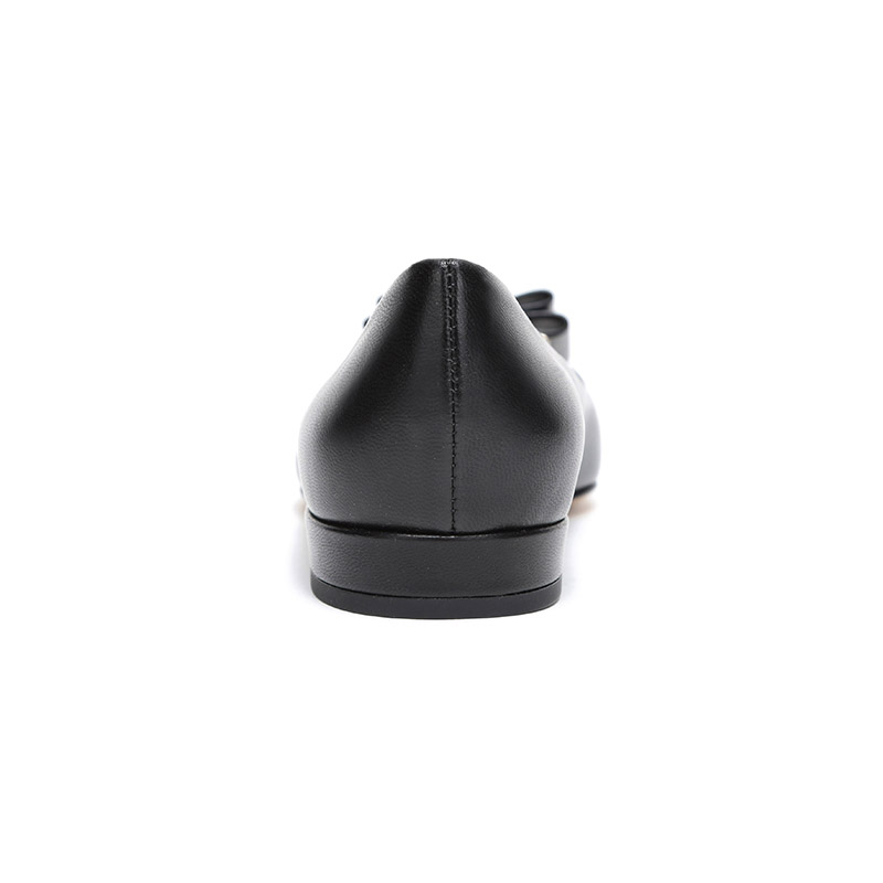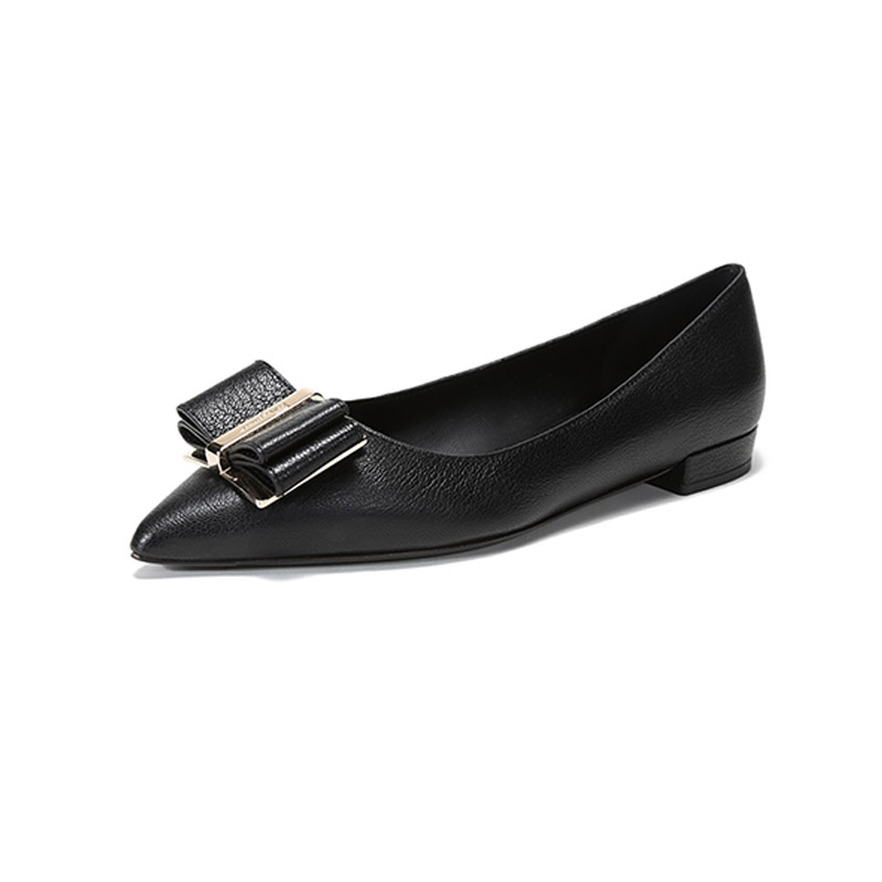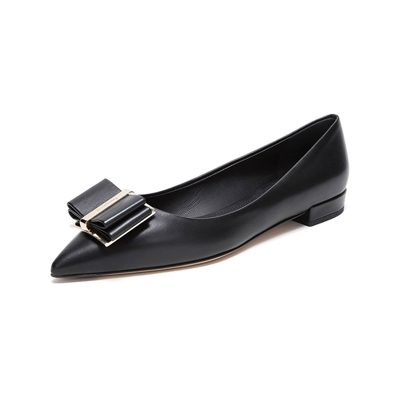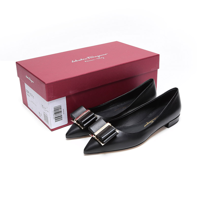 自营Ferragamo 菲拉格慕 女士黑色皮质双蝴蝶结平底鞋尖头单鞋 0704646