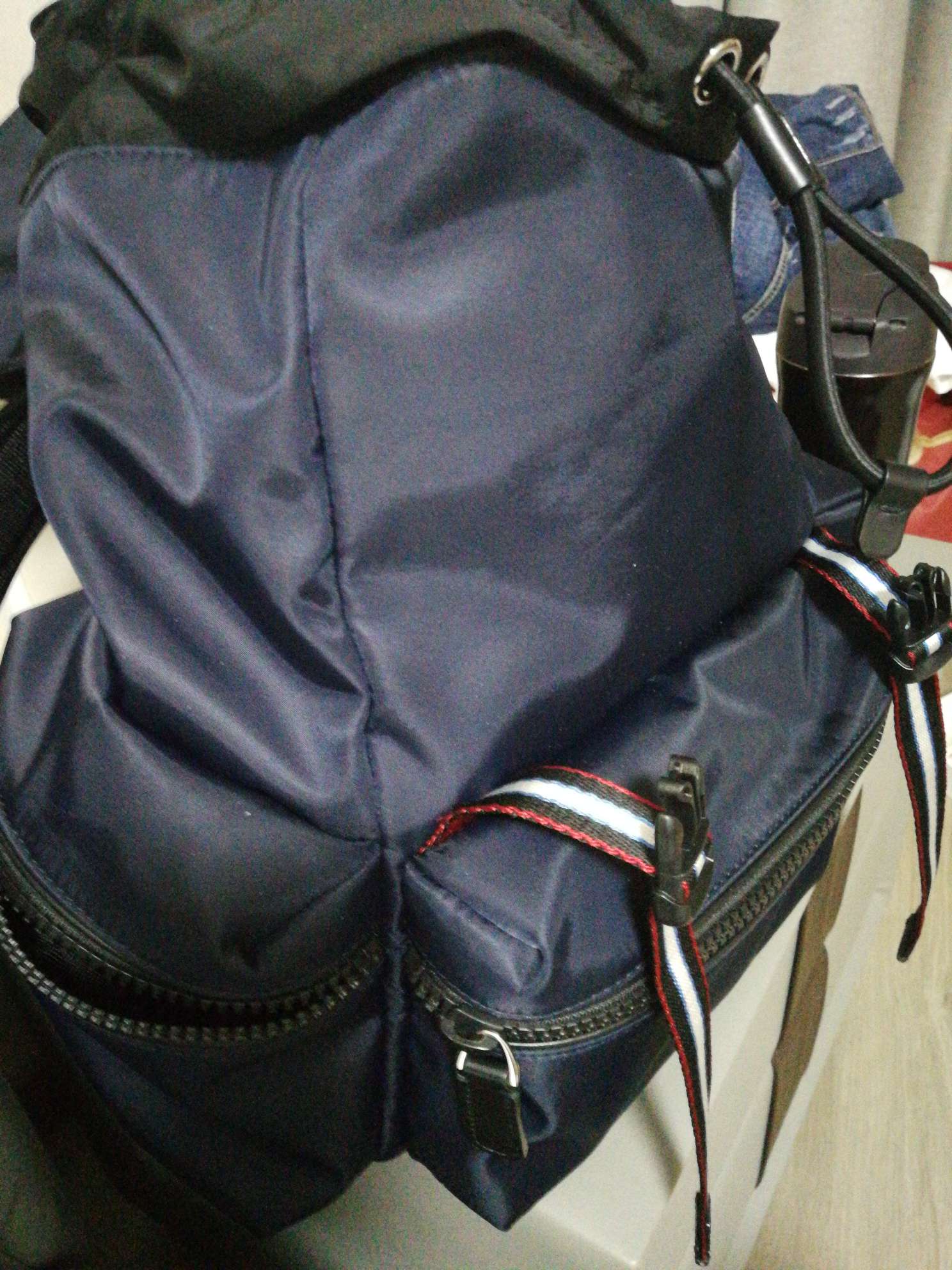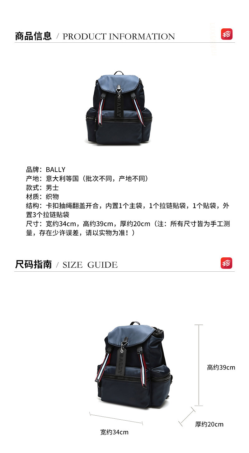 - 内部结构:内置1个主袋,1个拉链贴袋,1个贴袋,外置3个拉链贴袋