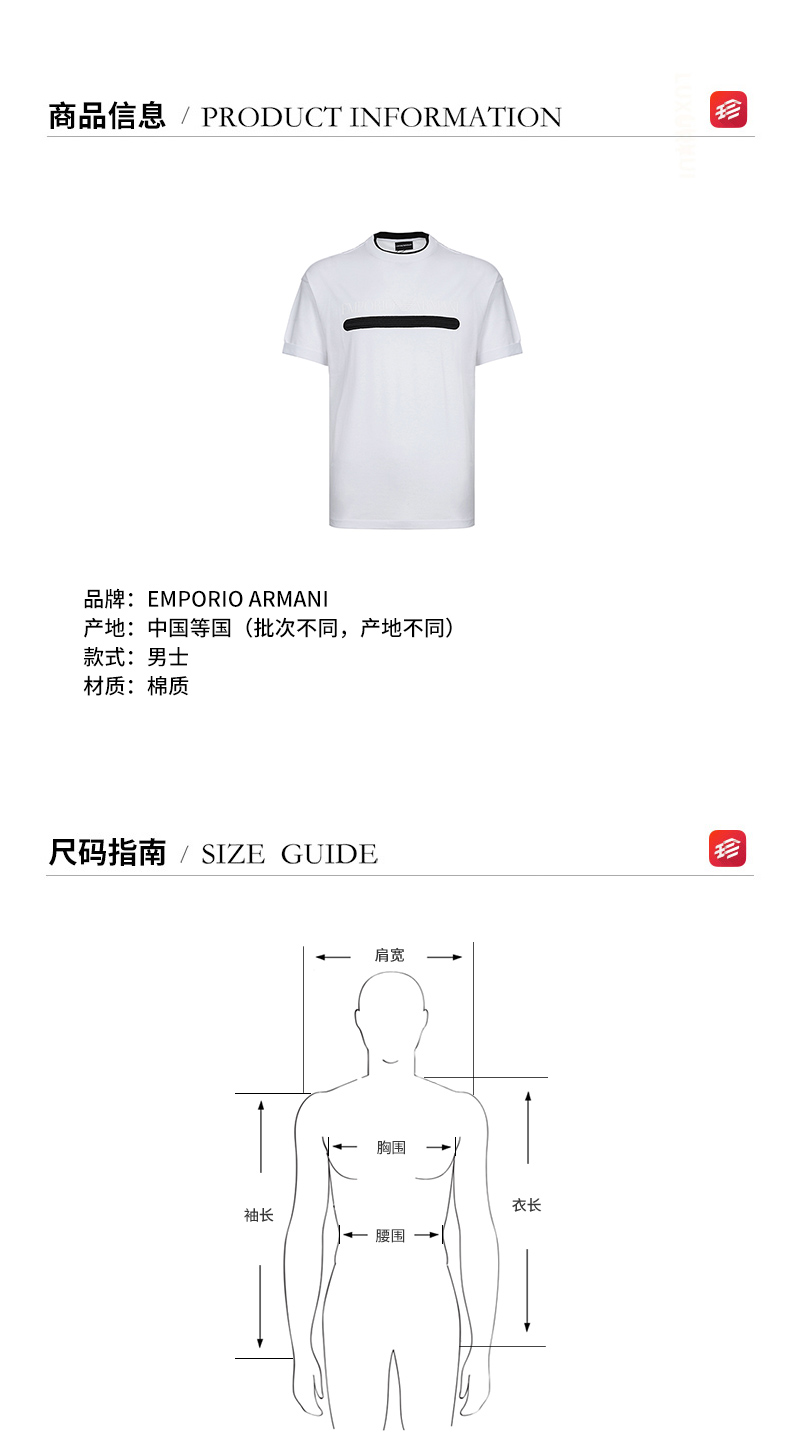自营Emporio Armani 阿玛尼 男士白色棉质圆领短袖T恤 3G1TL8 1JTUZ F106