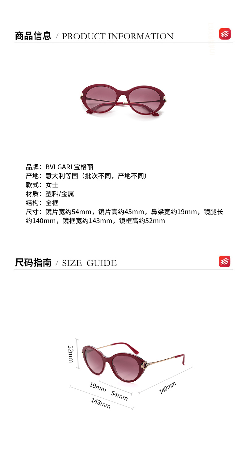 自营Bvlgari 宝格丽 女士酒红色金色镜框深紫色渐变镜片塑料/金属太阳镜眼镜 0BV8216B 54328H 54