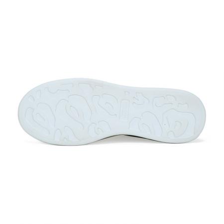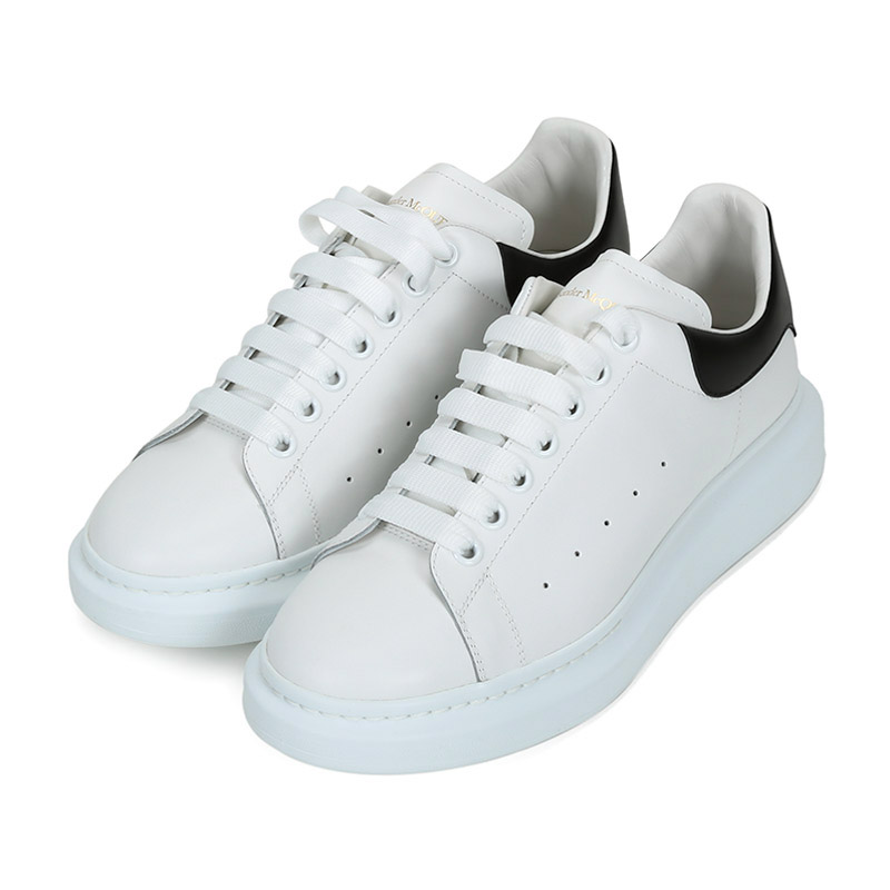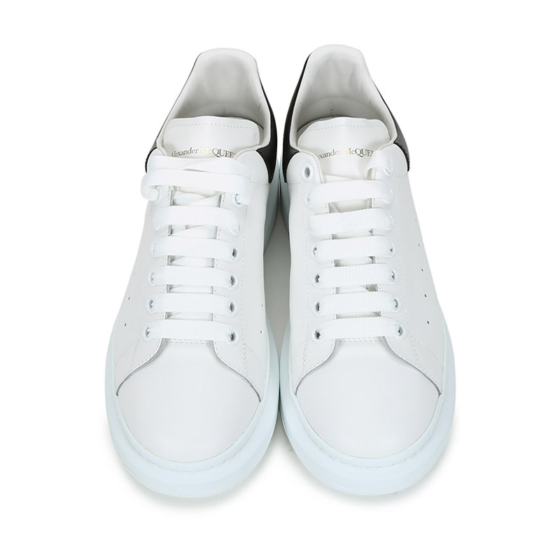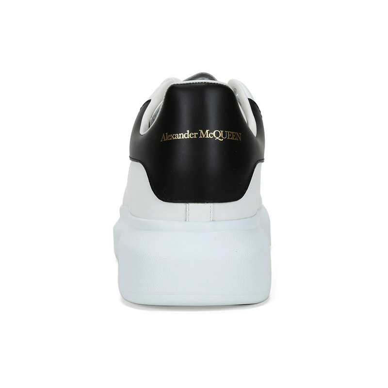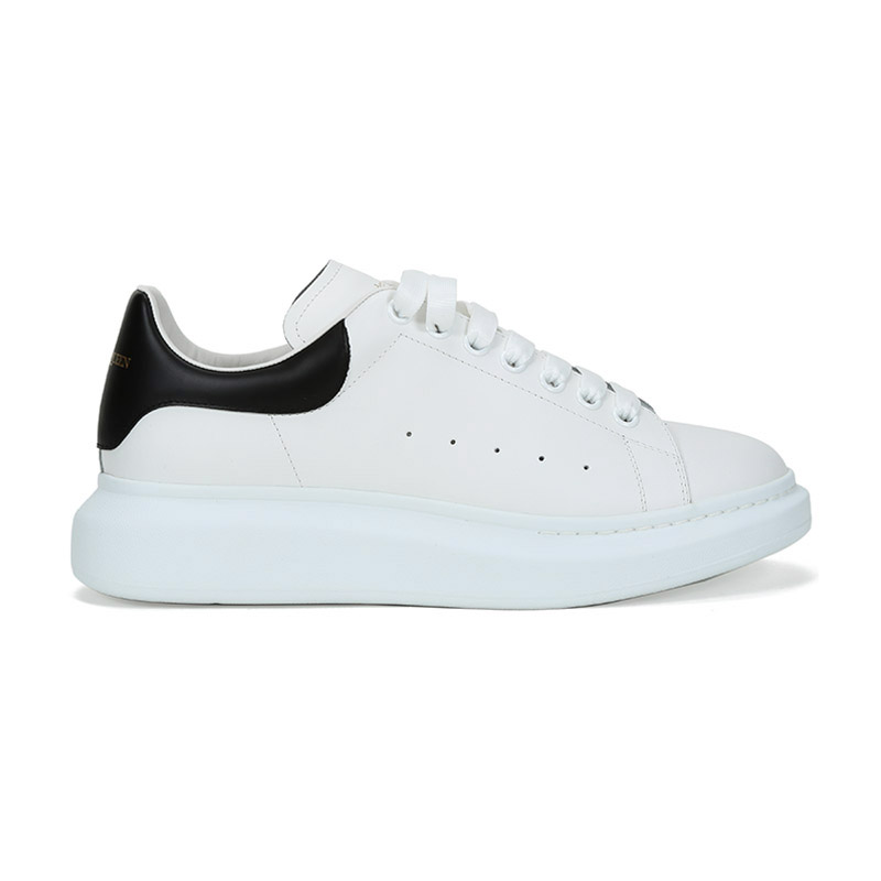 - 白色光滑小牛皮系带运动鞋,圆头设计,鞋跟点缀黑色皮革细节。搭配宽扁鞋带,鞋舌和后帮饰有 Alexander McQueen 品牌标志