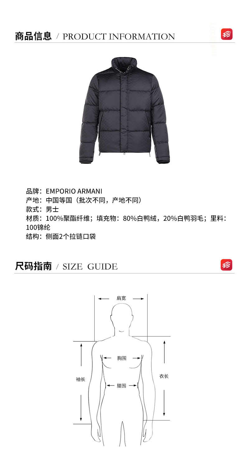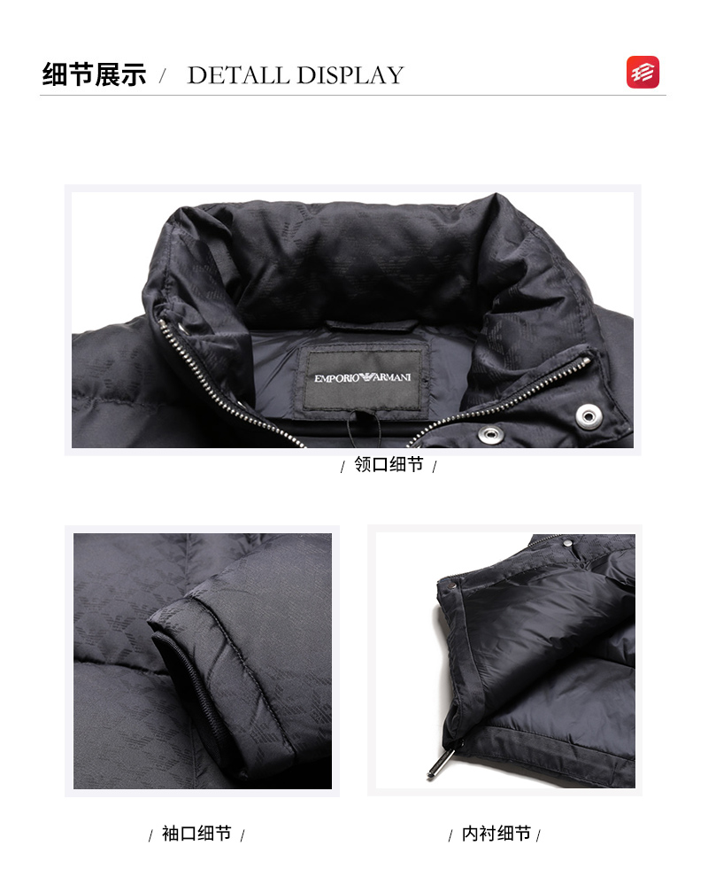 自营Emporio Armani 阿玛尼 男士聚酯纤维鸭绒羽绒服夹克外套海军蓝提花标识 8N1BN3 1NHQZ F976