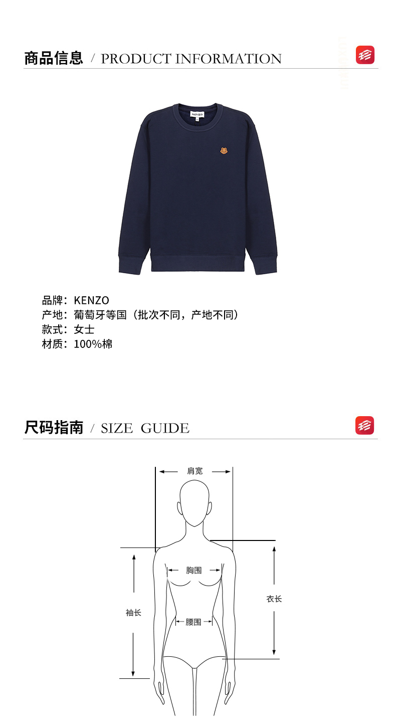 自营Kenzo 高田贤三 女士棉质圆领长袖卫衣运动衫海军蓝小虎头刺绣 FB5 2SW820 4ML 76
