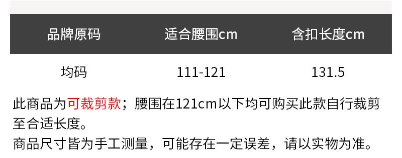 - 结构:板扣式腰带,5个扣眼,长度可裁剪