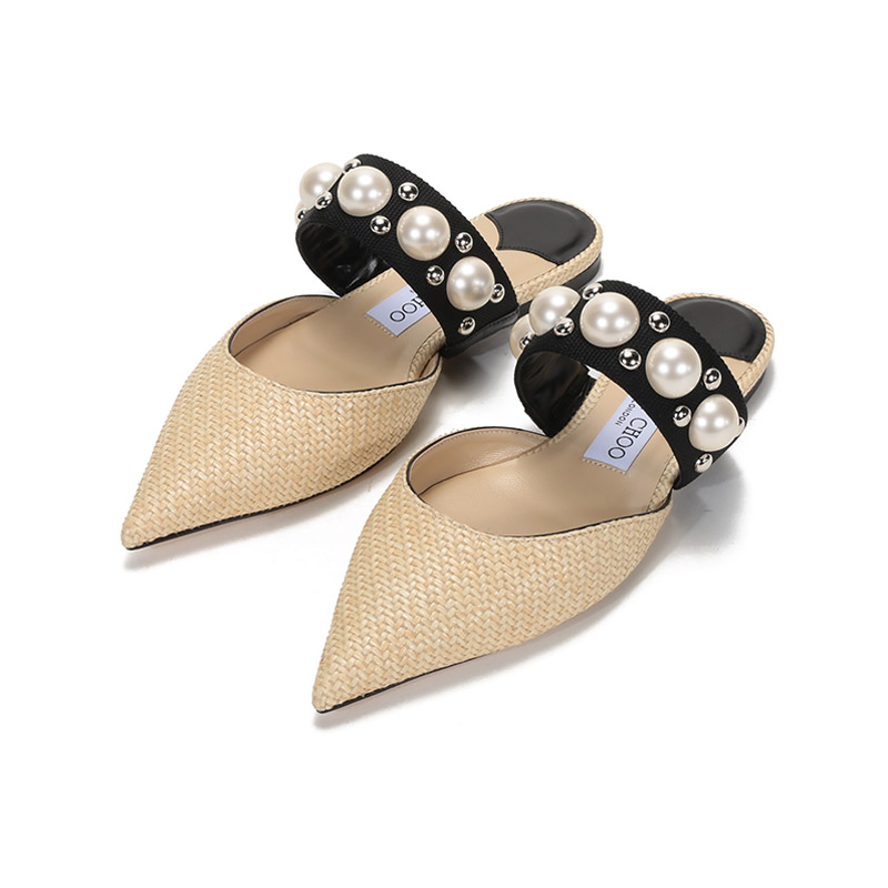 - BASETTE系列平底鞋,尖头穆勒鞋造型,足弓绑带点缀珍珠和半圆铆钉,耀眼别致。日常时尚穿搭点睛鞋履。