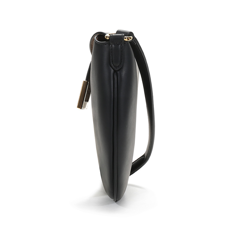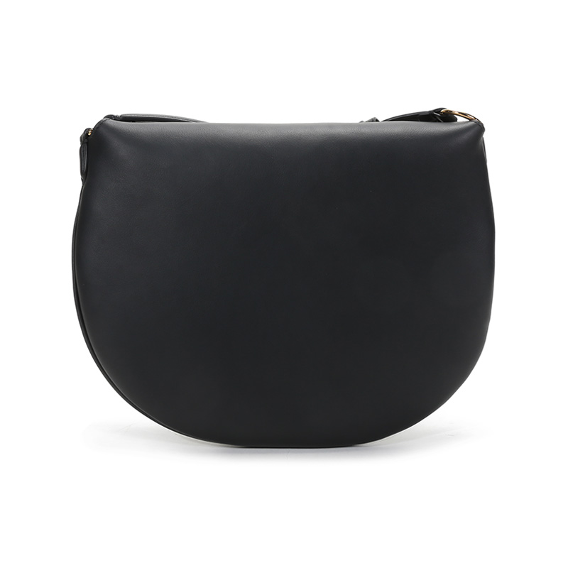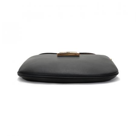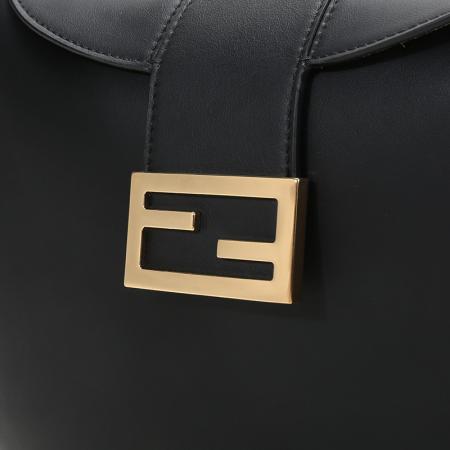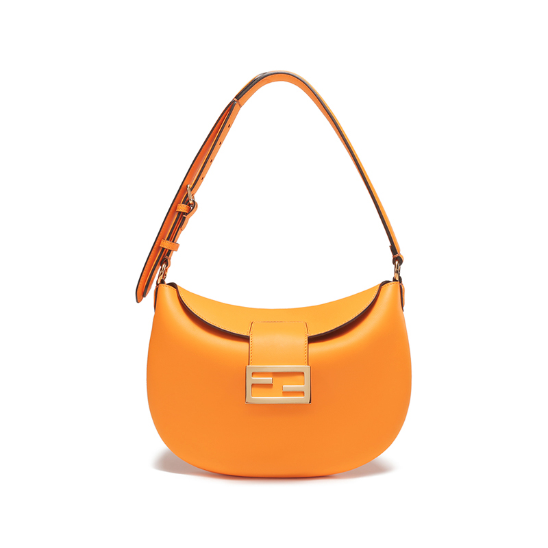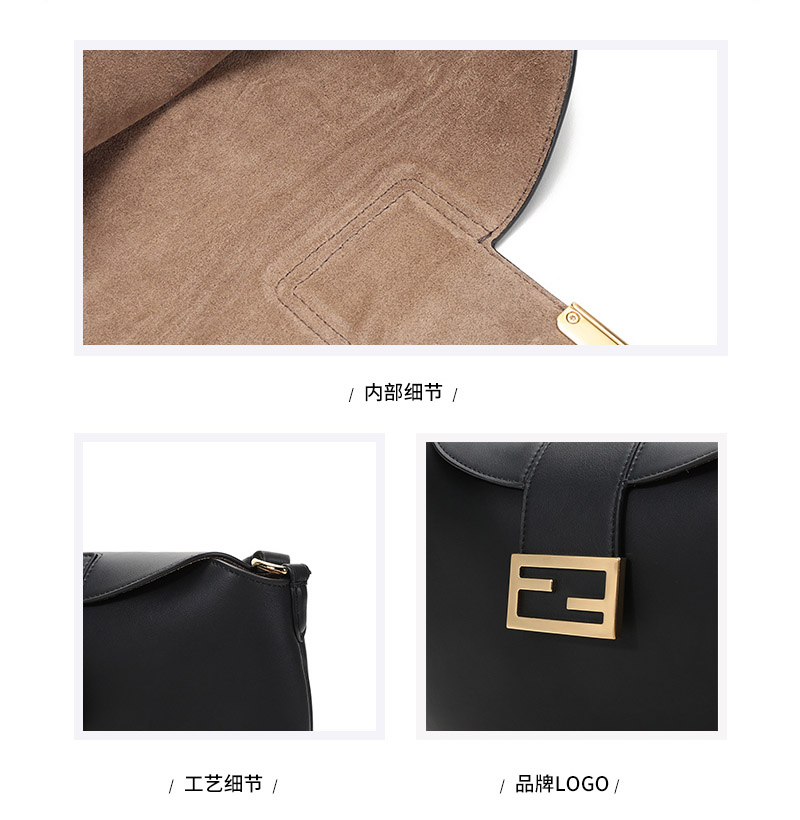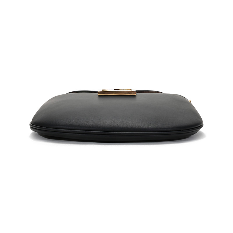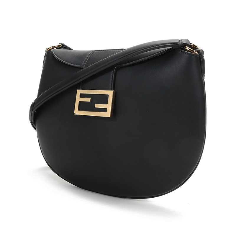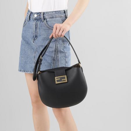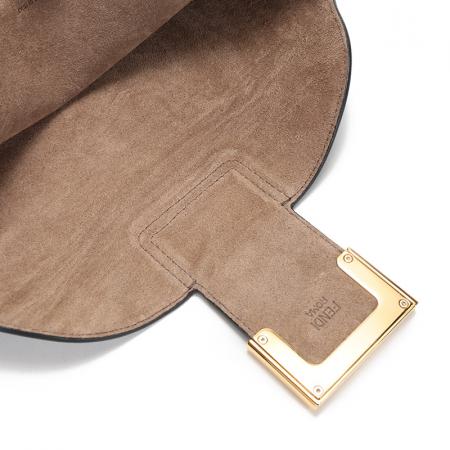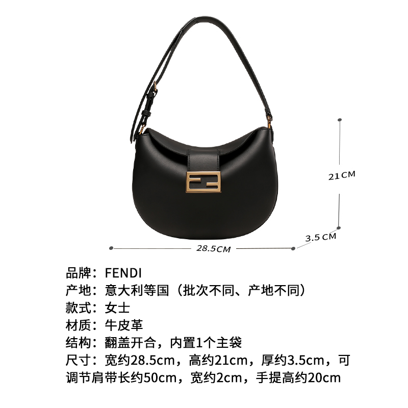 - 小号牛角新月包,皮革材质,并配FF搭扣。设有正面翻盖、无内衬的内部隔层,采用金色金属件。手袋配有可调节式肩带,可手拿或肩背。