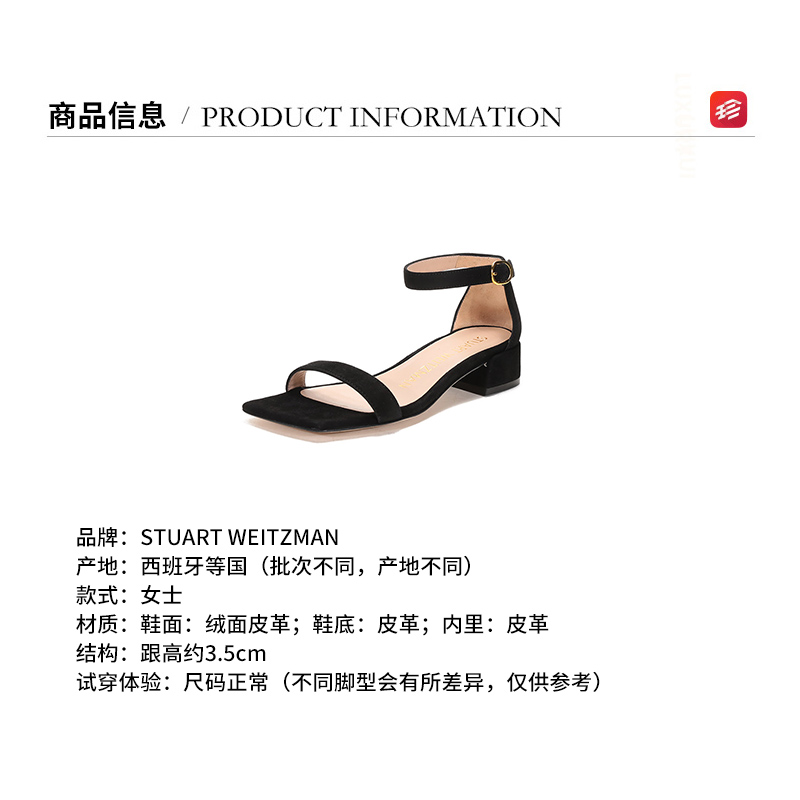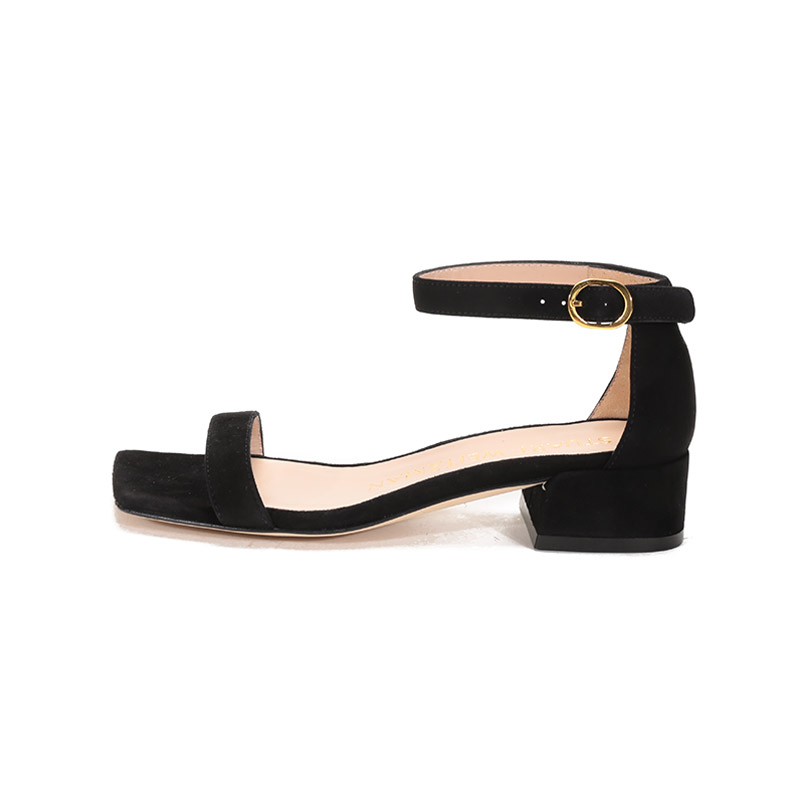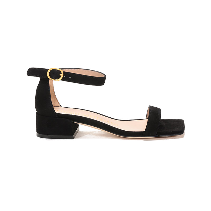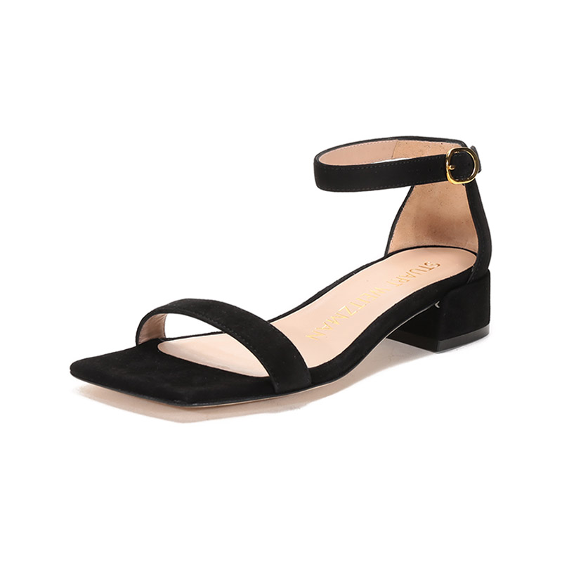 自营Stuart Weitzman 思缇韦曼 女士绒面皮革斜方头一字带粗跟凉鞋黑色 NUDISTJUNE SQUARE BLK SUE SUEDE