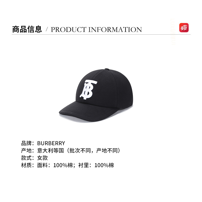 自营Burberry 博柏利 女款棉质帽子棒球帽鸭舌帽黑色TB专属标识刺绣 80381411