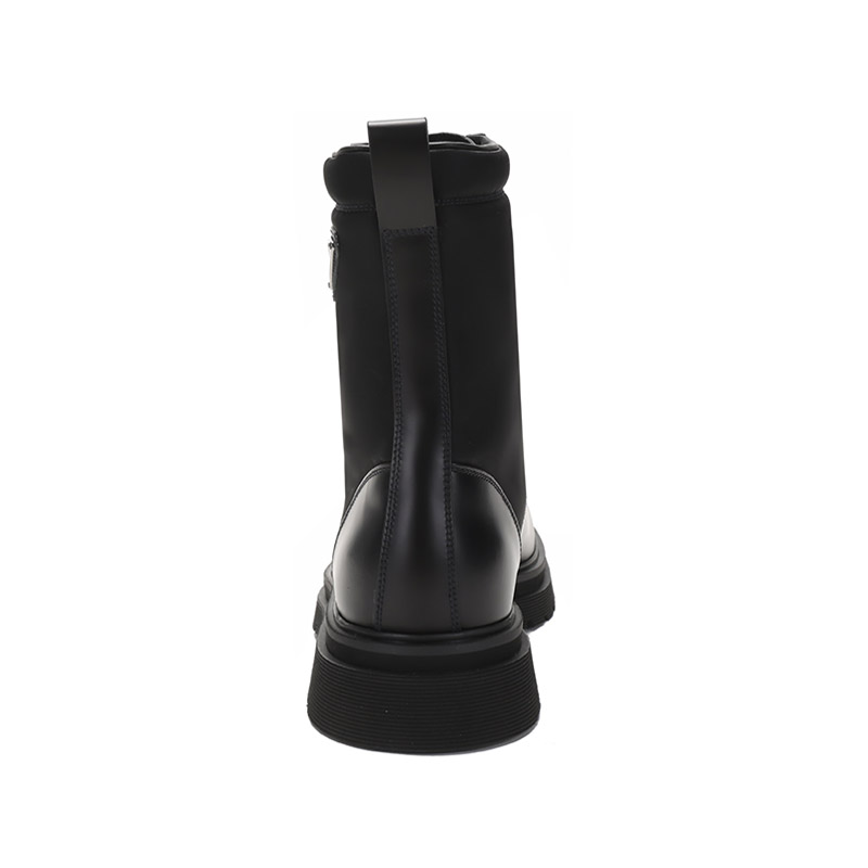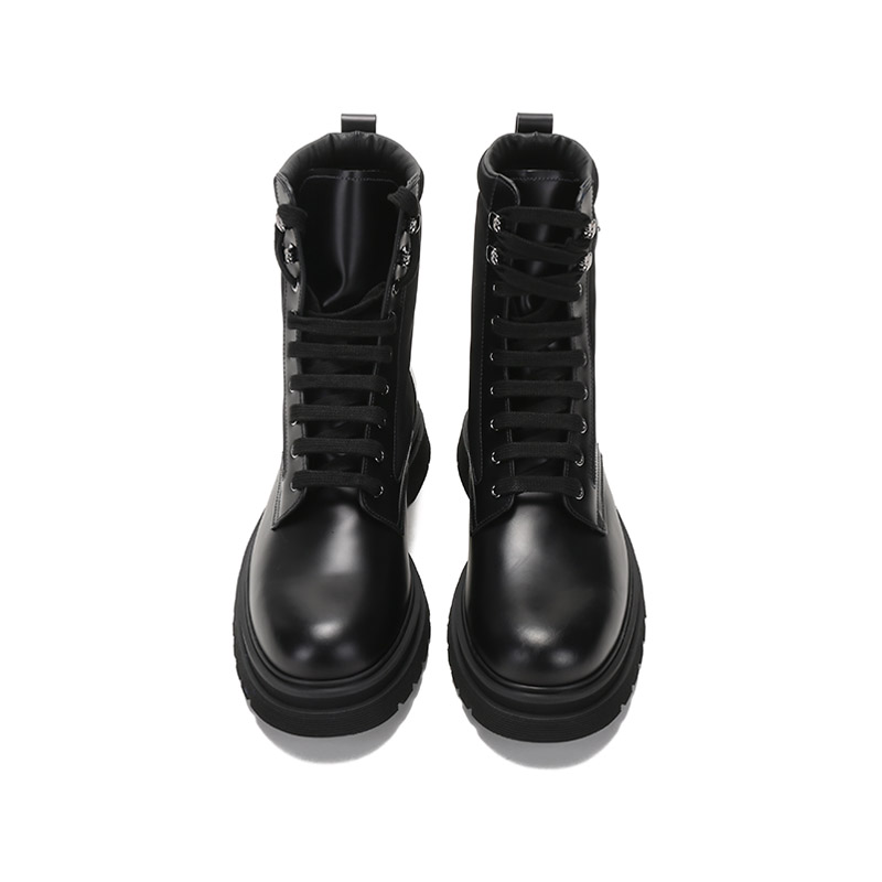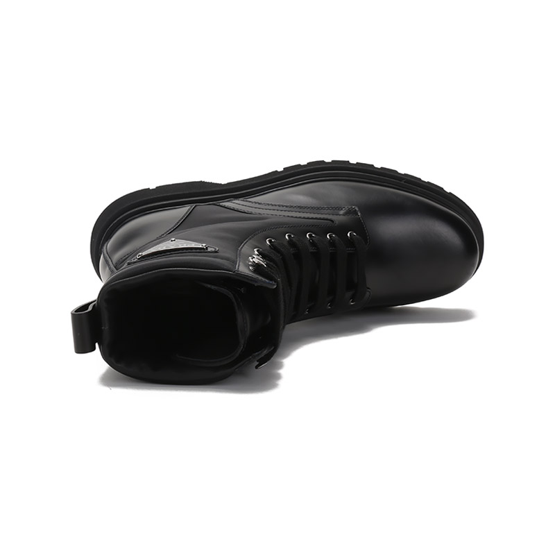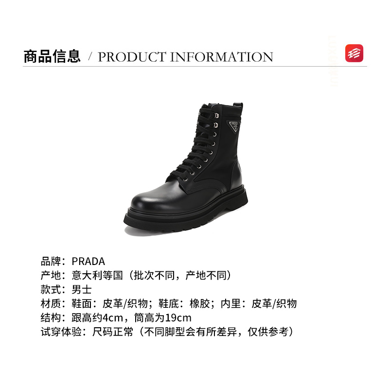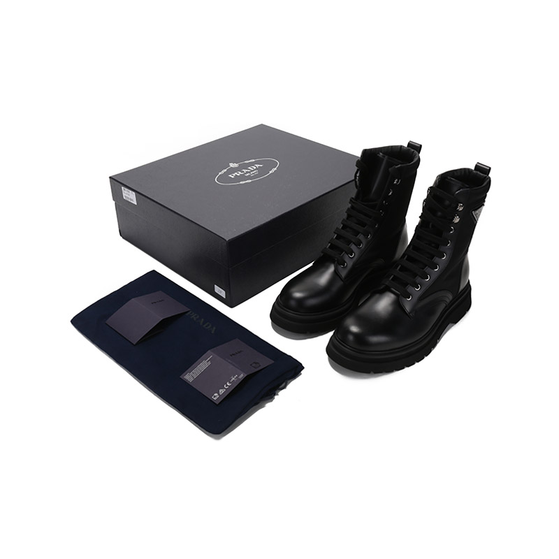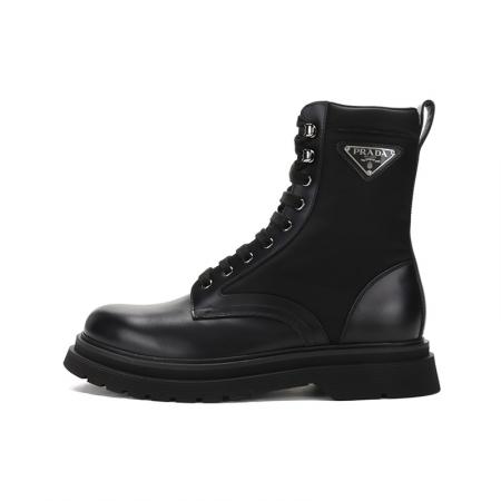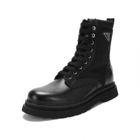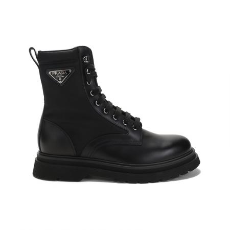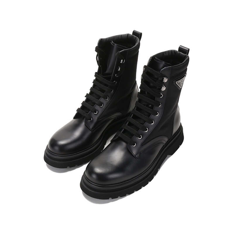 自营Prada 普拉达 男士皮革/织物Rois系带LOGO拼接踝靴马丁靴靴子短靴黑色 2UE011 3LFR F0002