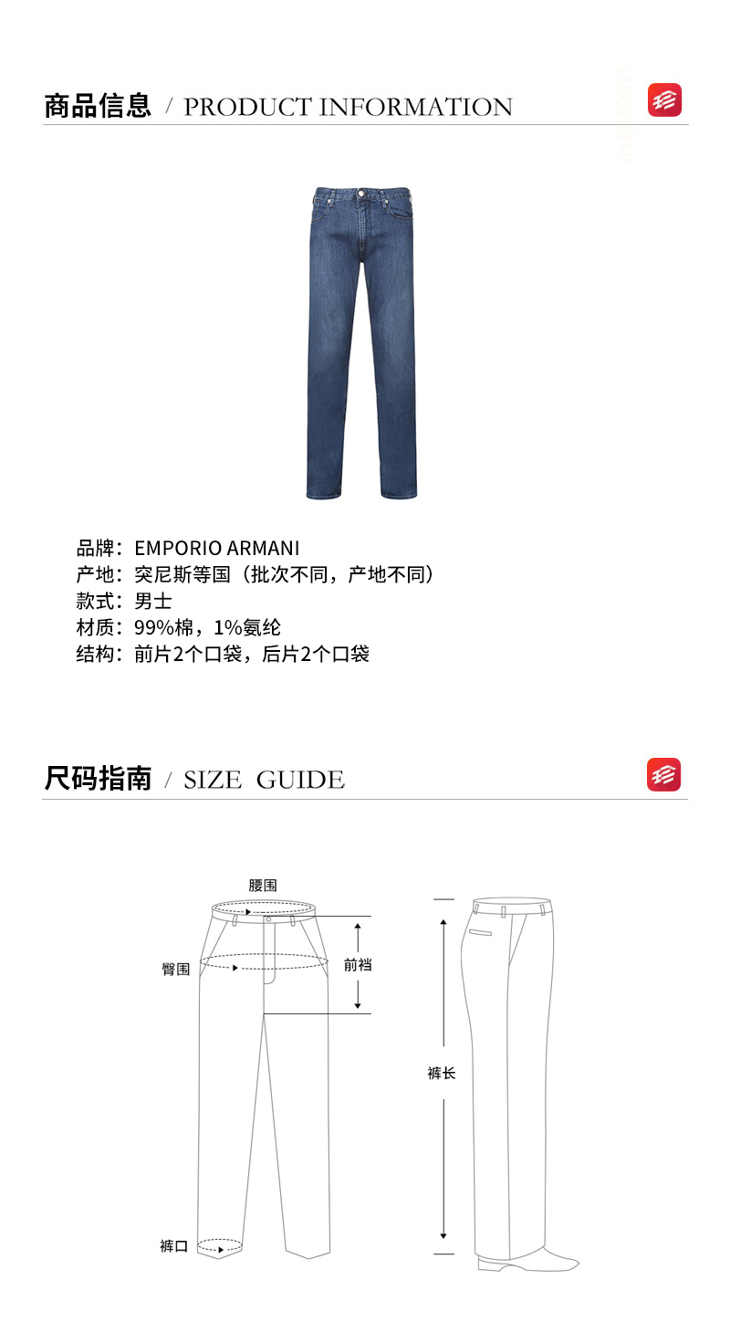 自营Emporio Armani 阿玛尼男士棉质修身版型薄款牛仔裤牛仔蓝 8N1J06 1D85Z 0943