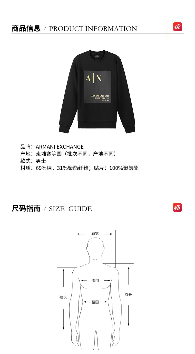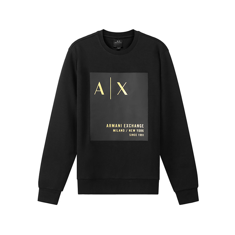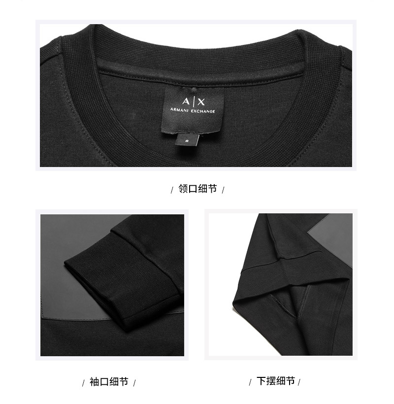 自营Armani Exchange 阿玛尼 男士棉/聚酯纤维/聚氨酯圆领长袖卫衣运动衫黑色LOGO贴饰 6KZMDB ZJ6PZ 1200