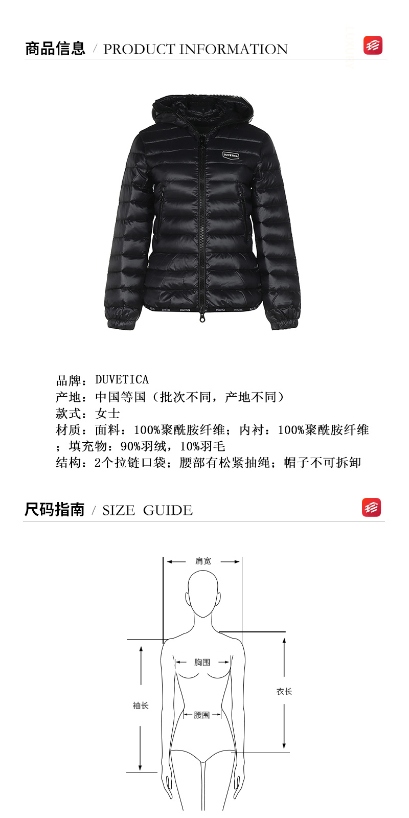 - 材质:面料:100%聚酰胺纤维;内衬:100%聚酰胺纤维;填充物:90%羽绒,10%羽毛