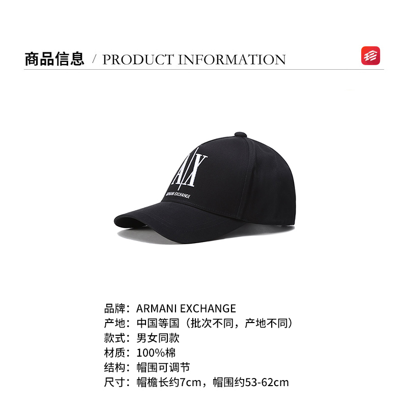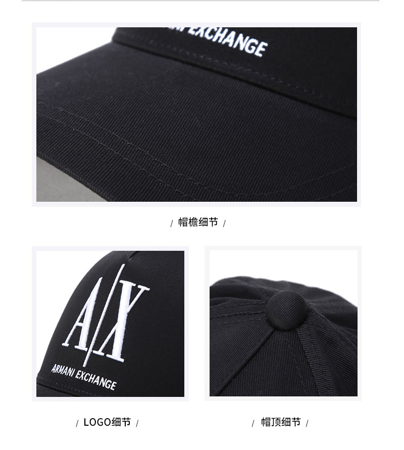 自营Armani Exchange 阿玛尼男女同款ICON系列棉质帽子鸭舌帽棒球帽黑色AX刺绣 954047 CC811 00020