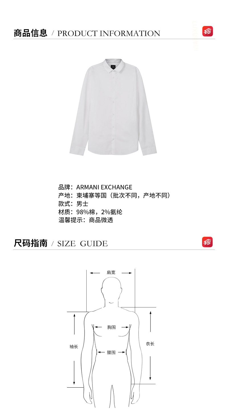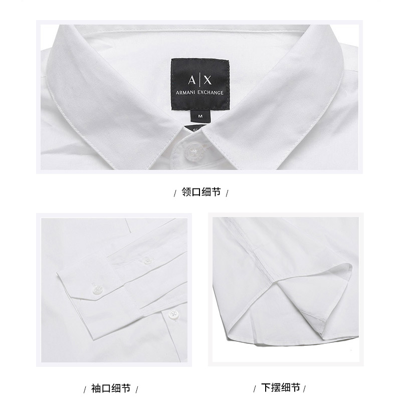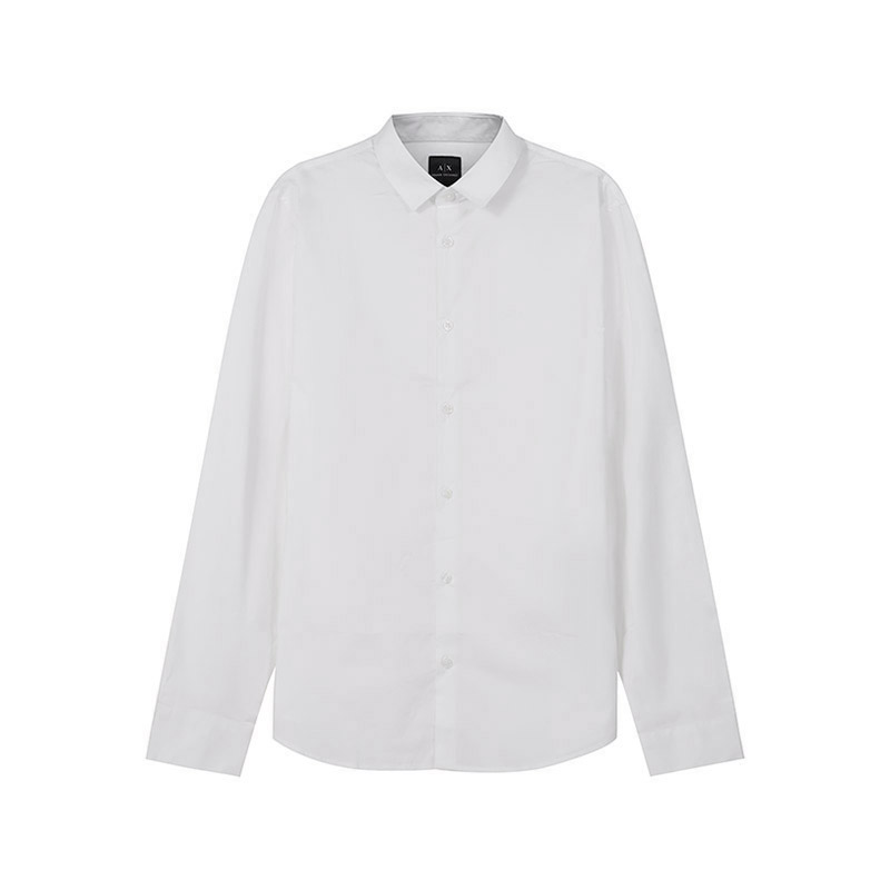 自营Armani Exchange 阿玛尼 男士棉质修身薄款长袖衬衫白色小AX刺绣 8NZC31 ZN28Z 1100
