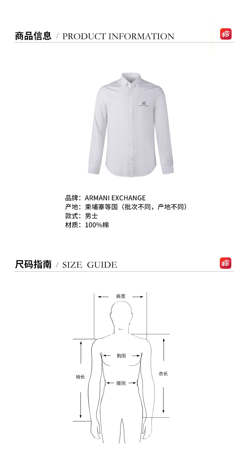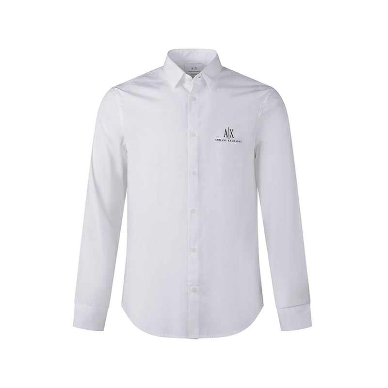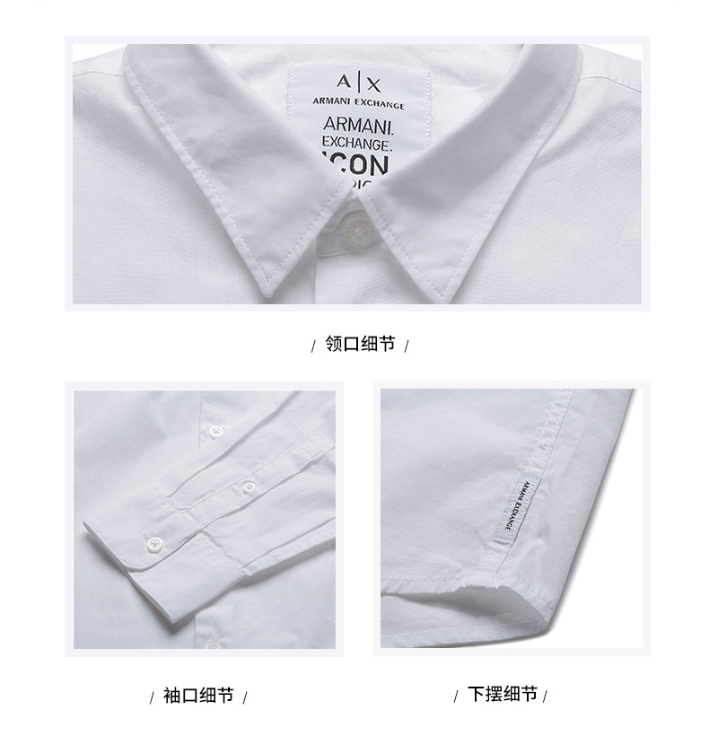 自营Armani Exchange 阿玛尼 男士AX棉质长袖衬衫白色LOGO刺绣 8NZCP2 ZNBJZ 1100