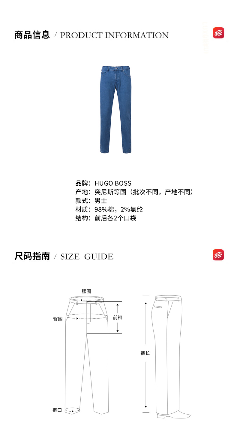 自营Hugo Boss 雨果博斯 男士棉质修身版牛仔裤长裤蓝色 50472990 433