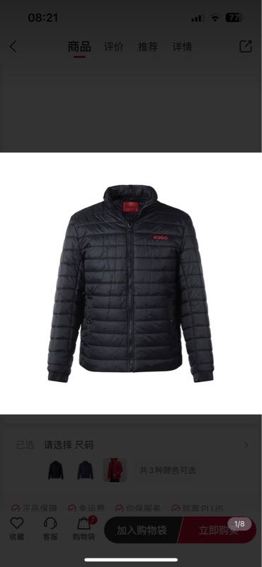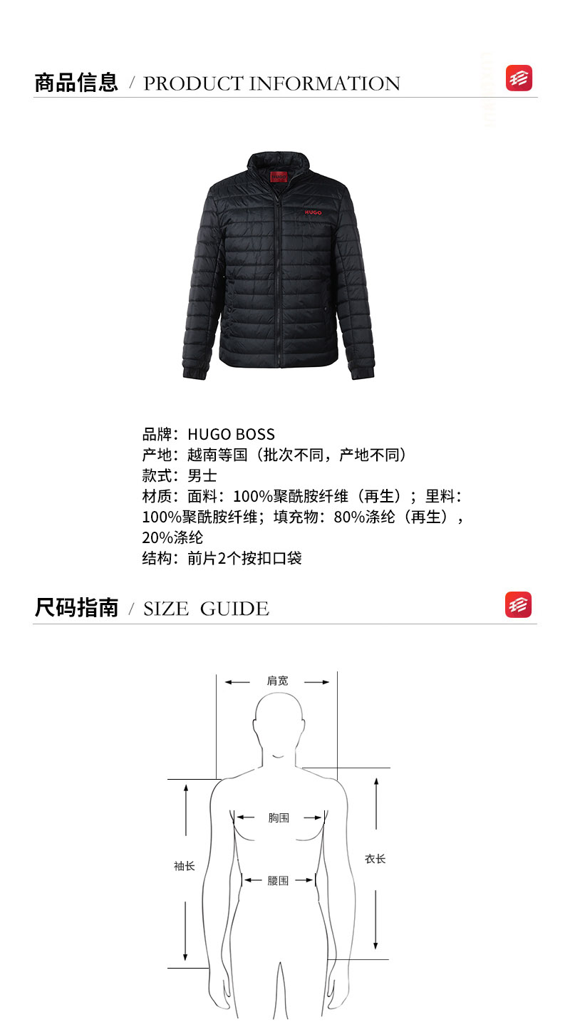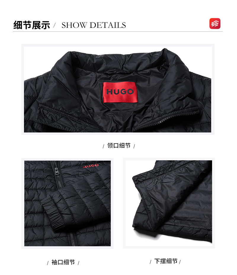 自营Hugo Boss 雨果博斯 男士HUGO系列修身薄款棉服外套黑色LOGO图案 50468719 001