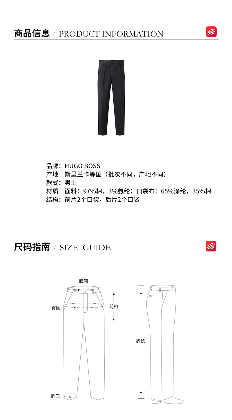 自营Hugo Boss 雨果博斯 男士棉质黑色常规版型做旧款锥形裤休闲裤 50477714 001