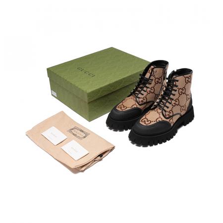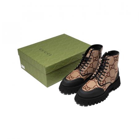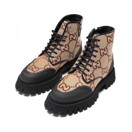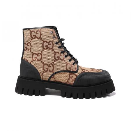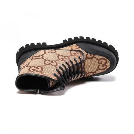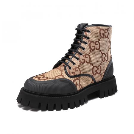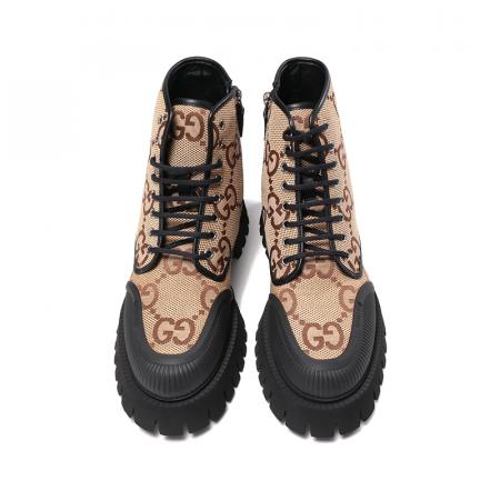 自营Gucci 古驰男士织物/橡胶GG拉链系带厚底靴子短靴驼色乌木色老花 699970 UKOF0 2590