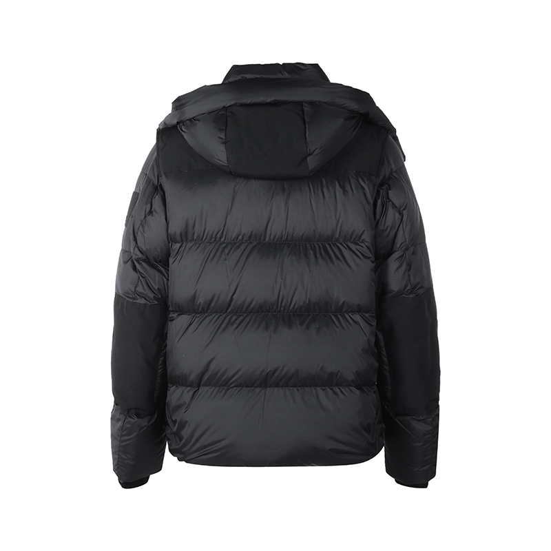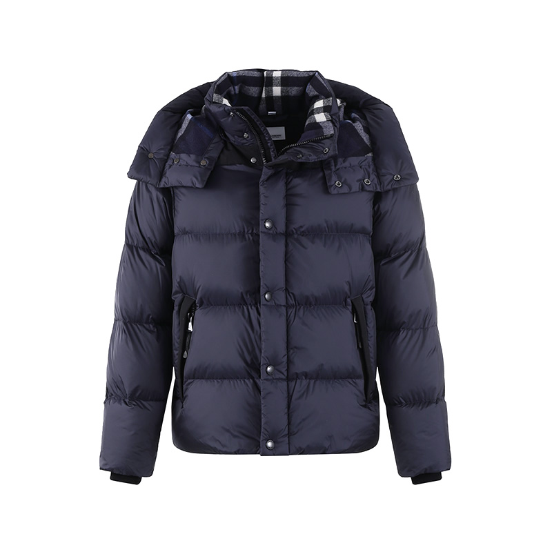 - 可调节式尼龙连帽羽绒外套,填充有鹅绒与鹅毛,呈现休闲版型。搭配同色裁片与 Vintage 格纹内衬衣领。解开可拆式衣袖,缔造背心造型。