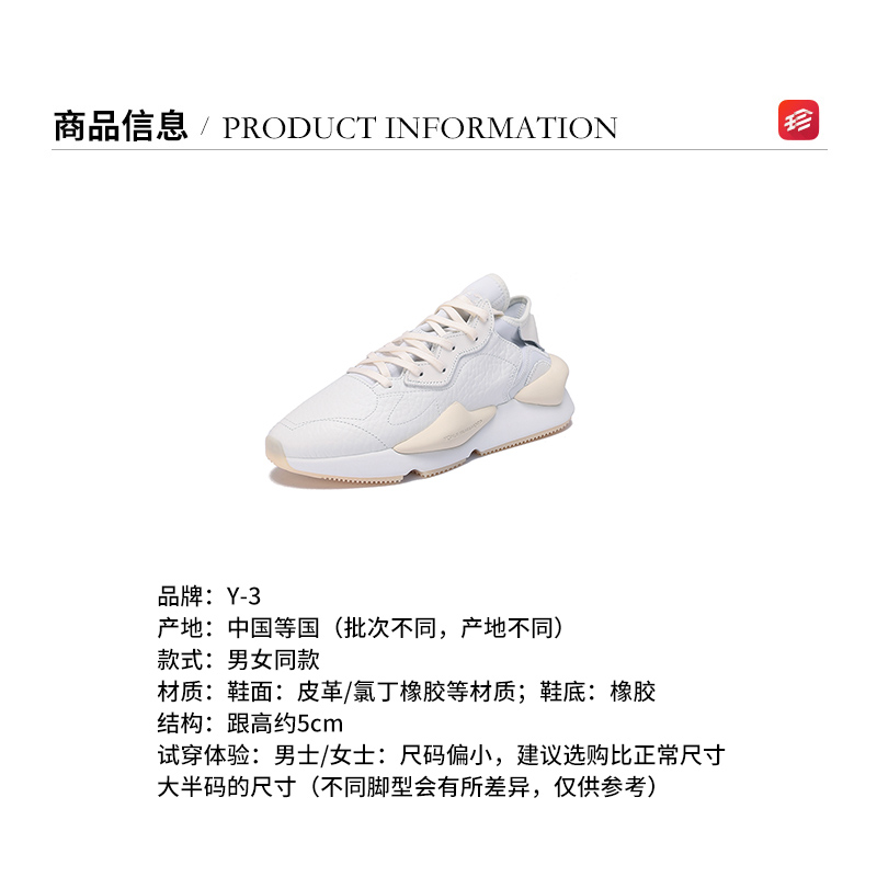 自营Y-3 男女同款白色KAIWA系带休闲运动鞋 HR1951