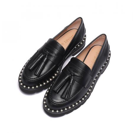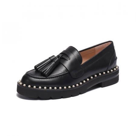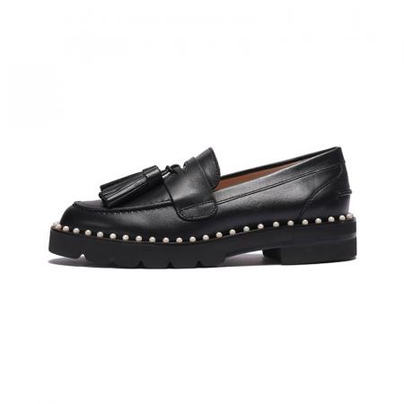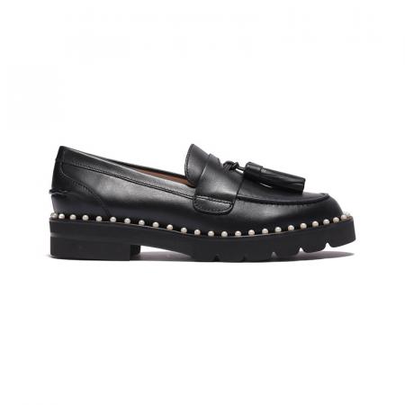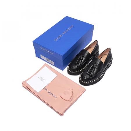 自营Stuart Weitzman 思缇韦曼女士牛皮乐福鞋单鞋皮鞋黑色流苏装饰 MILA LIFT PEARL LOAF BLACK CHI CHIFFON CALF