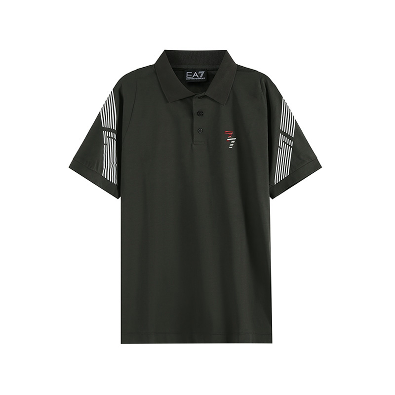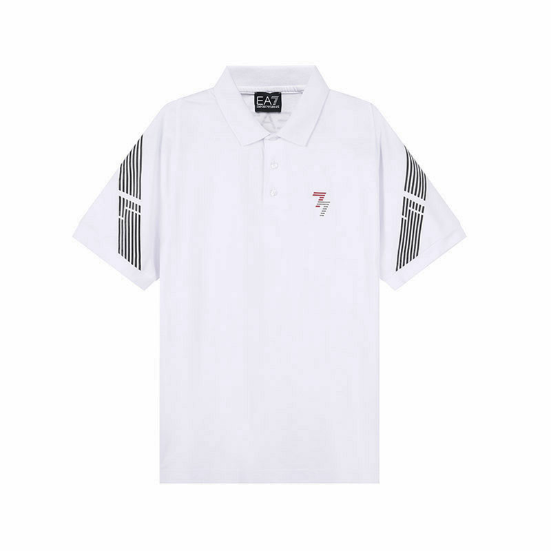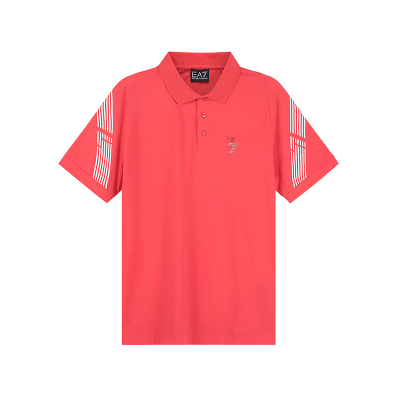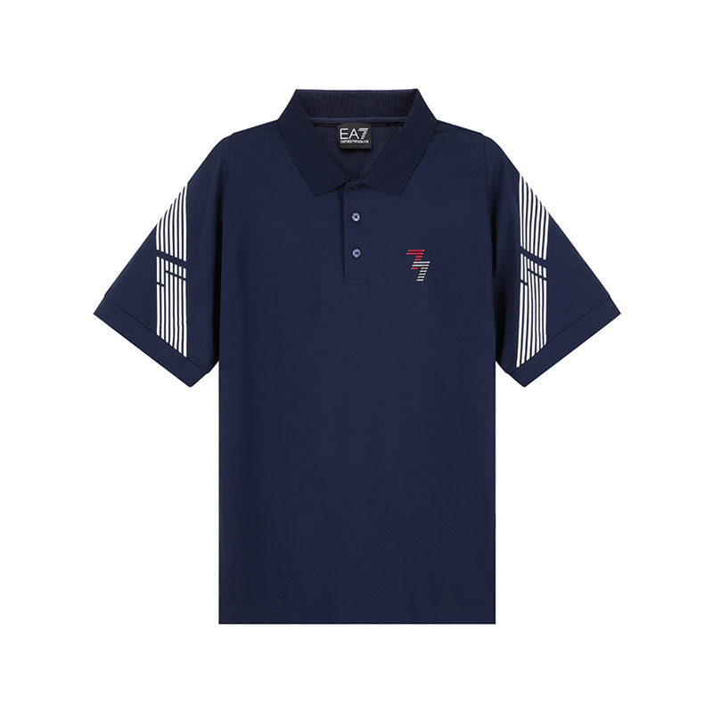 - 此款EA7短袖POLO衫采用简洁主义设计,搭配经典的三粒扣翻领版型,两侧衣袖饰有撞色线条印花,胸口双色"7"标识,与背面撞色 EA7 标识呼应,颇具品牌辨识度。