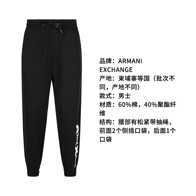 自营Armani Exchange 阿玛尼 男士黑色徽标胶印运动休闲裤长裤卫裤 3RZPFA ZJXAZ 1200
