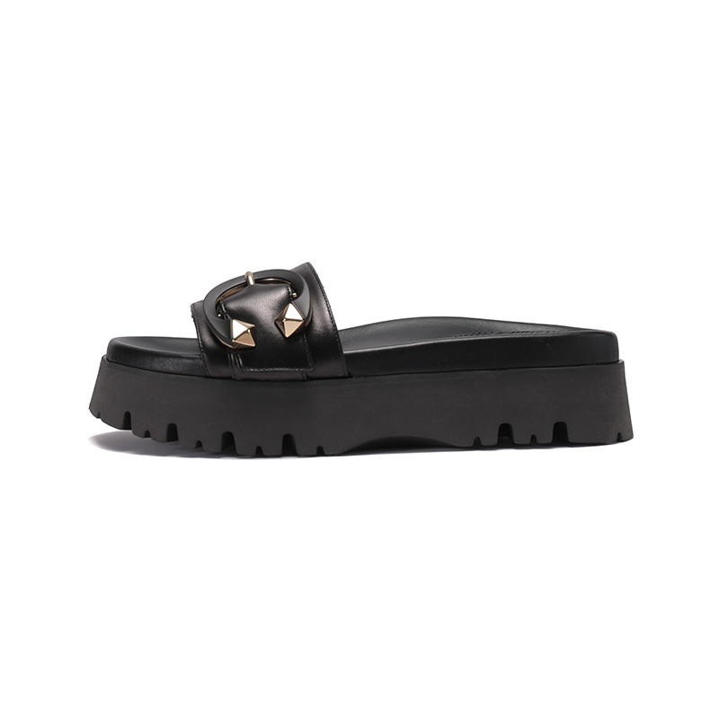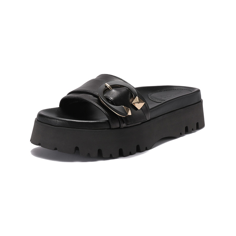 - 这款平底凉鞋饰有时尚的标志性C形带扣,散发出现代气息。随性的皮革设计,搭配宽大的鞋跟,提升外观。