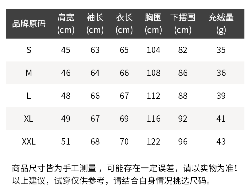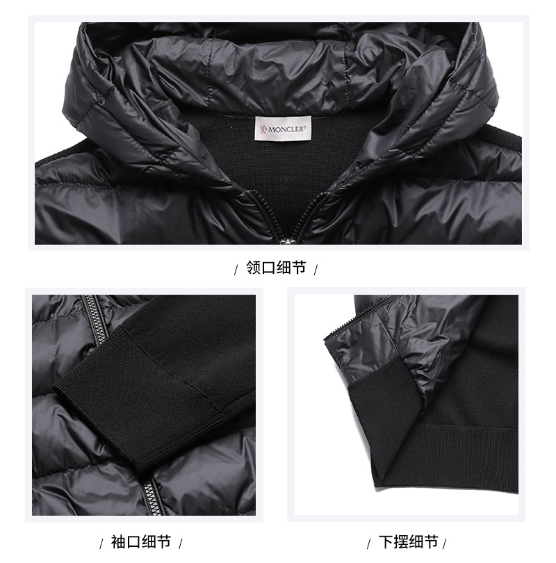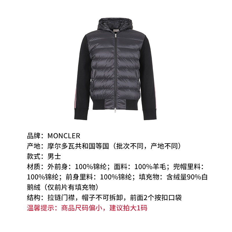 - 材质:外前身:100%锦纶;面料:100%羊毛;兜帽里料:100%锦纶;前身里料:100%锦纶;填充物:含绒量90%白鹅绒(仅前片有填充物)