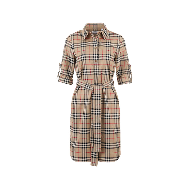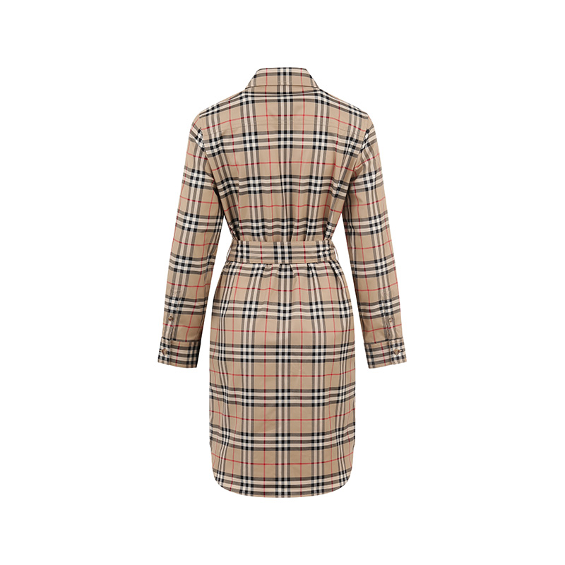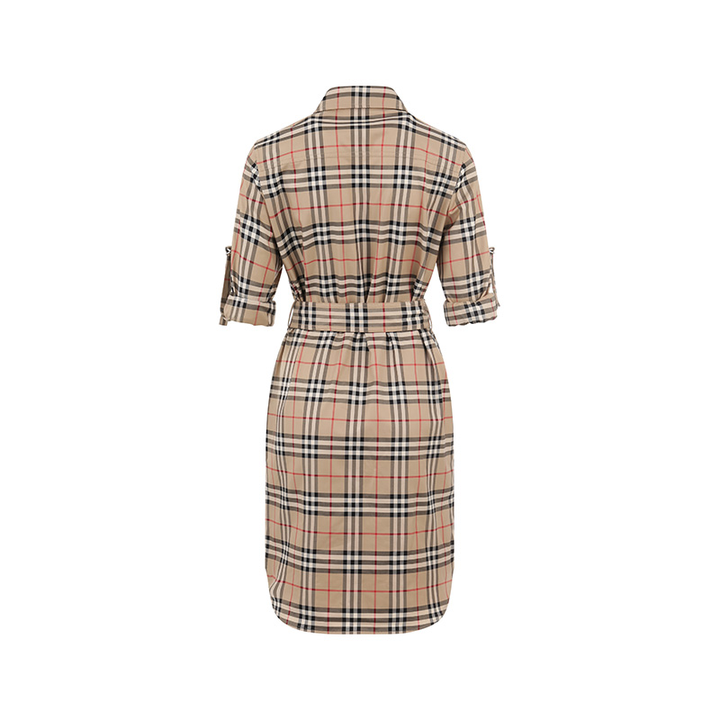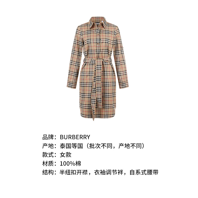 自营Burberry 博柏利 女款棉质典藏米色格纹美拉德风系腰衬衫裙衬衫式连衣裙 80634981