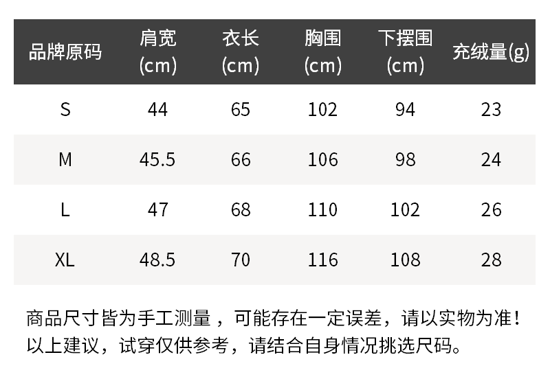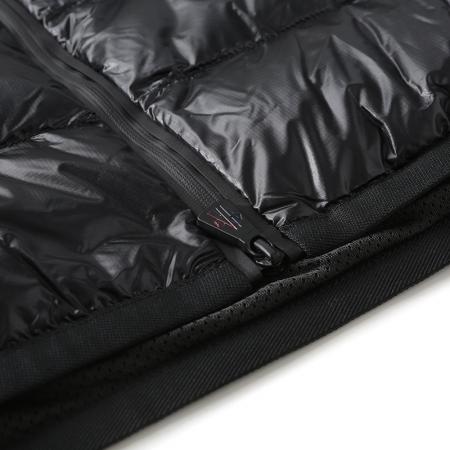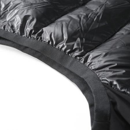 - 材质:外前身:100%锦纶;面料:86%锦纶,14%氨纶;领衬:100%锦纶;前身里料:100%锦纶;后片里料:100%聚酯纤维;衣领:100%锦纶;面料1:75%锦纶,25%氨纶;填充物 含绒量:90%白鹅绒(只有前身有填充物)