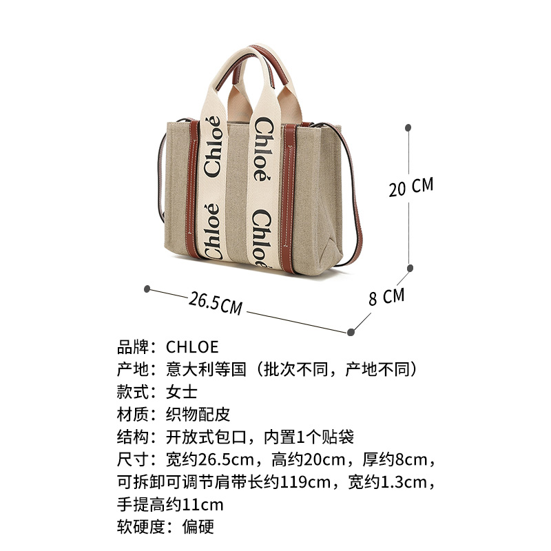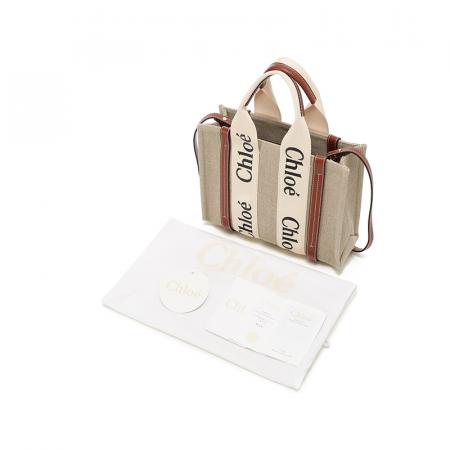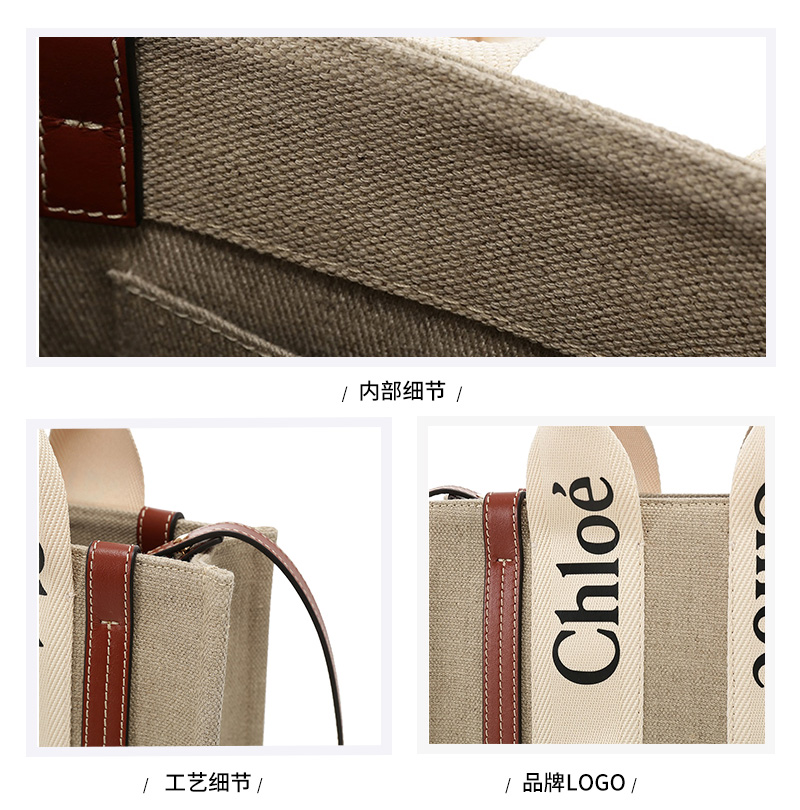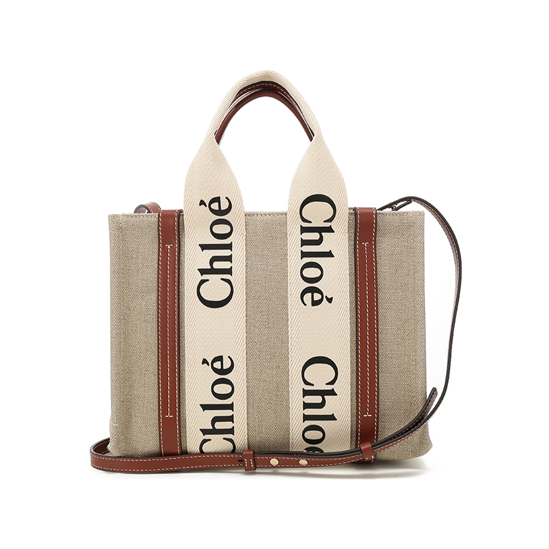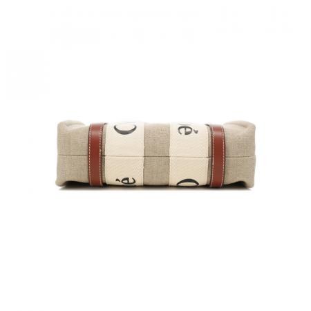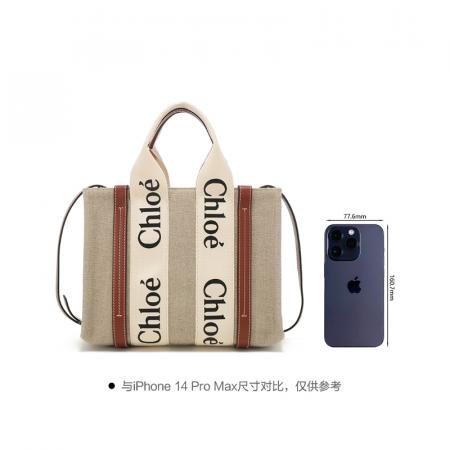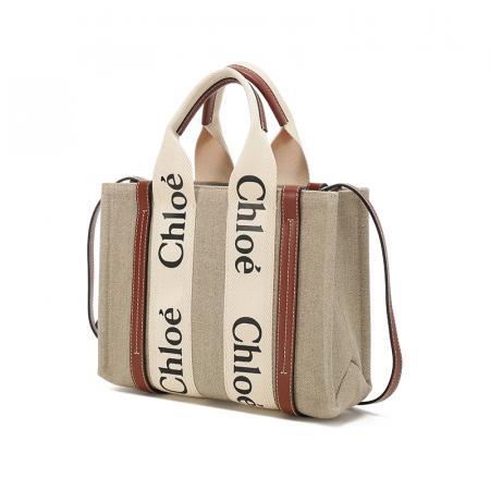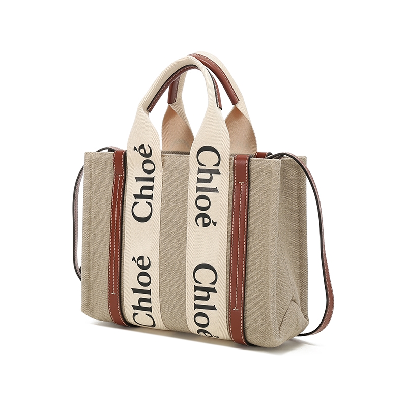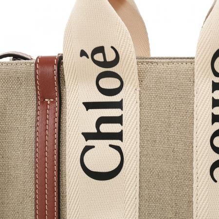 自营Chloé 蔻依 【新品】女包 女士WOODY系列织物配皮亚麻色棕色徽标饰带托特包购物袋帆布包手提单肩斜挎包小号 CHC22AS397I2690U