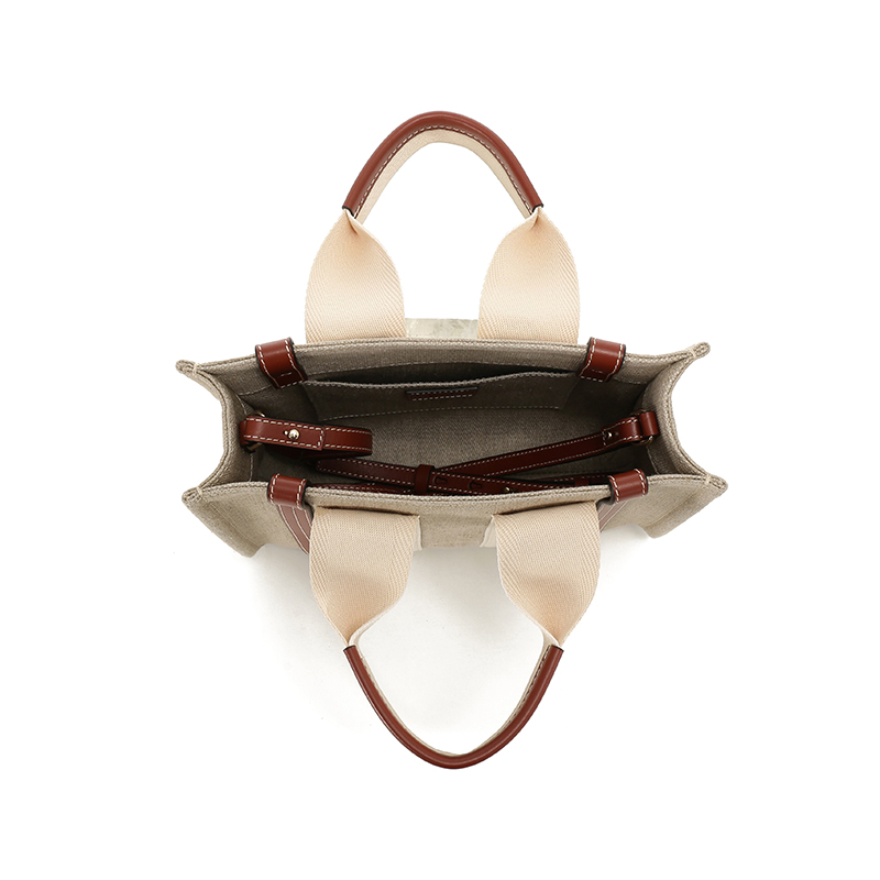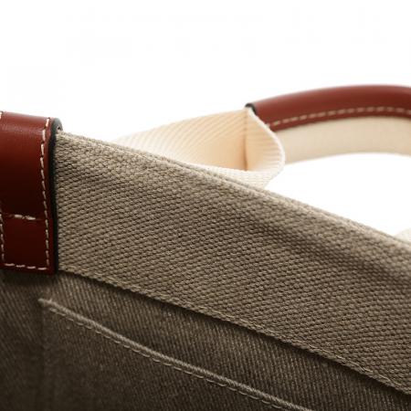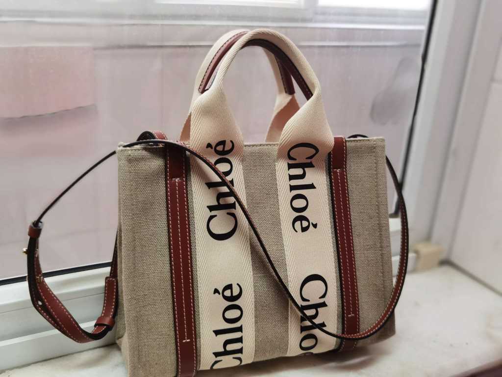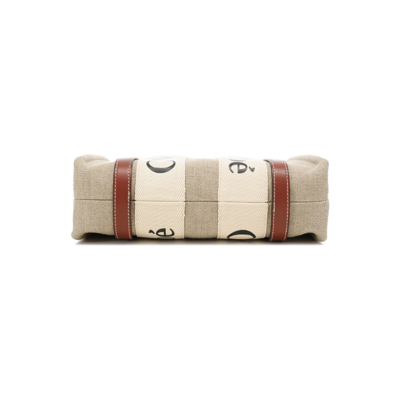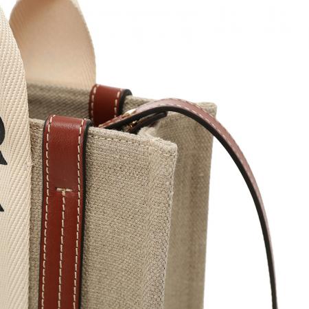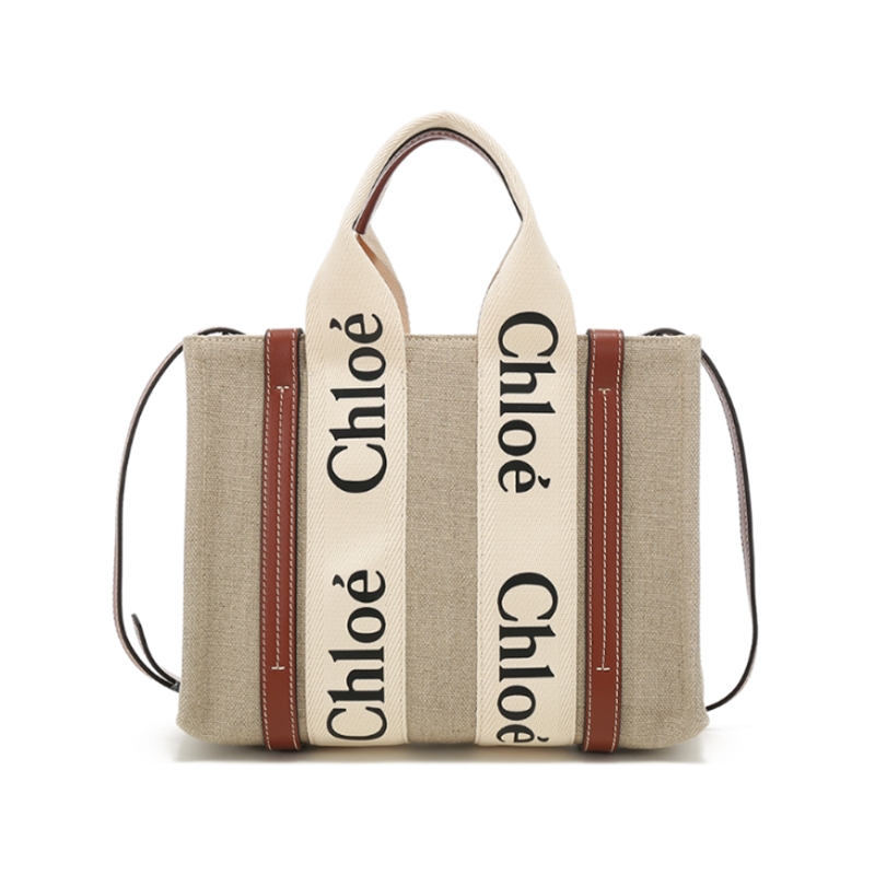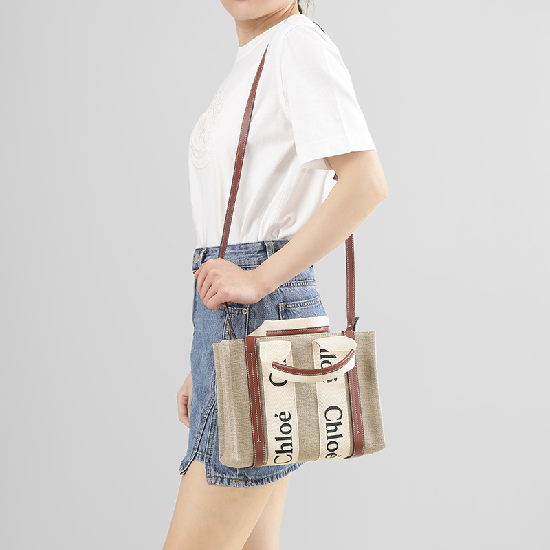 自营Chloé 蔻依 【新品】女包 女士WOODY系列织物配皮亚麻色棕色徽标饰带托特包购物袋帆布包手提单肩斜挎包小号 CHC22AS397I2690U