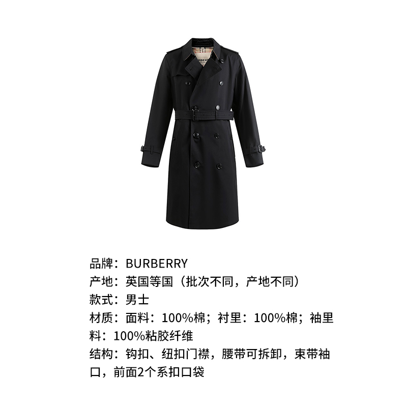 自营Burberry 博柏利【新品】男士棉质黑色肯辛顿版型中长款Heritage Trench双排扣风衣大衣外套 80793861